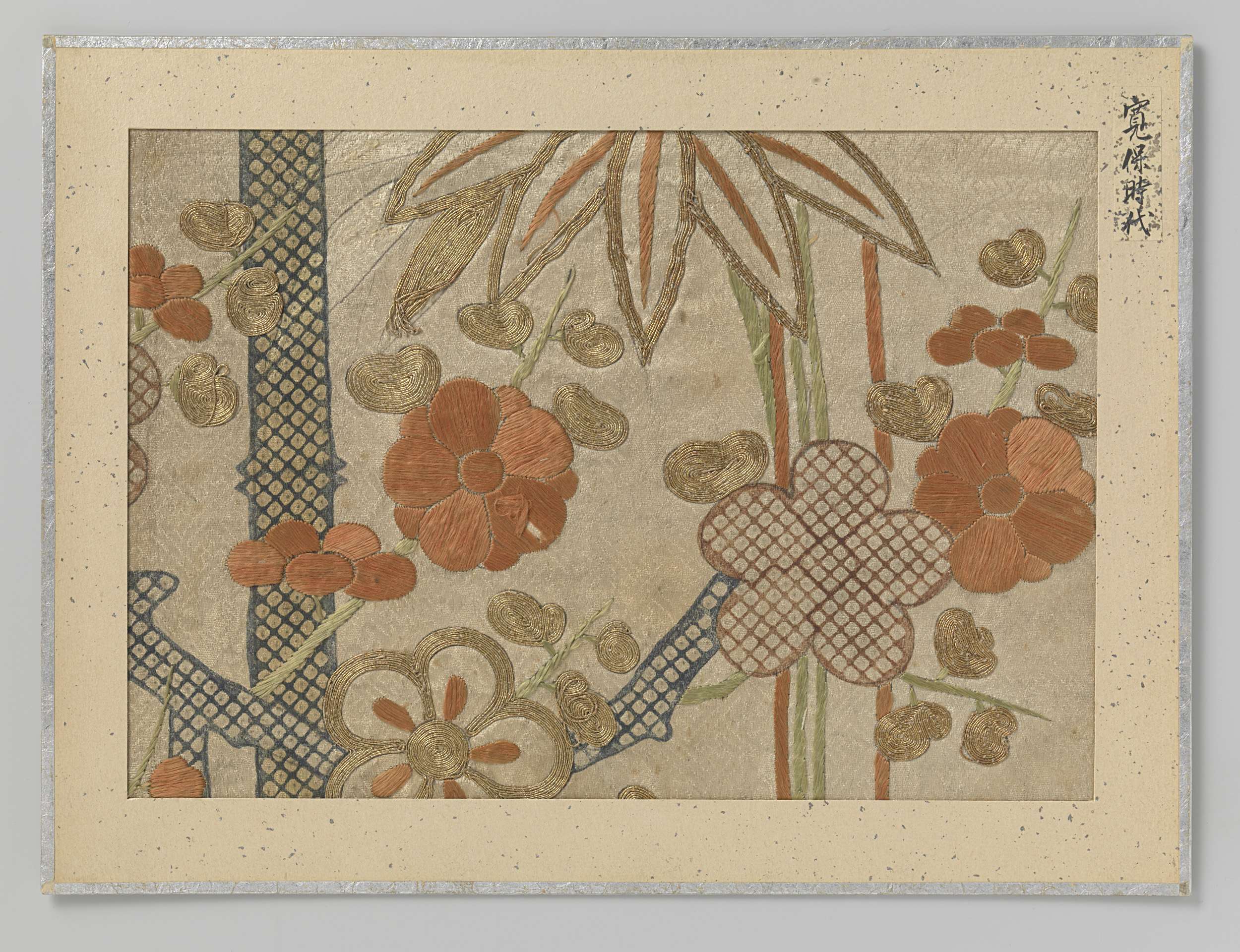 Textielfragment, borduursel en druk van bloemen en planten op beige achtergrond.