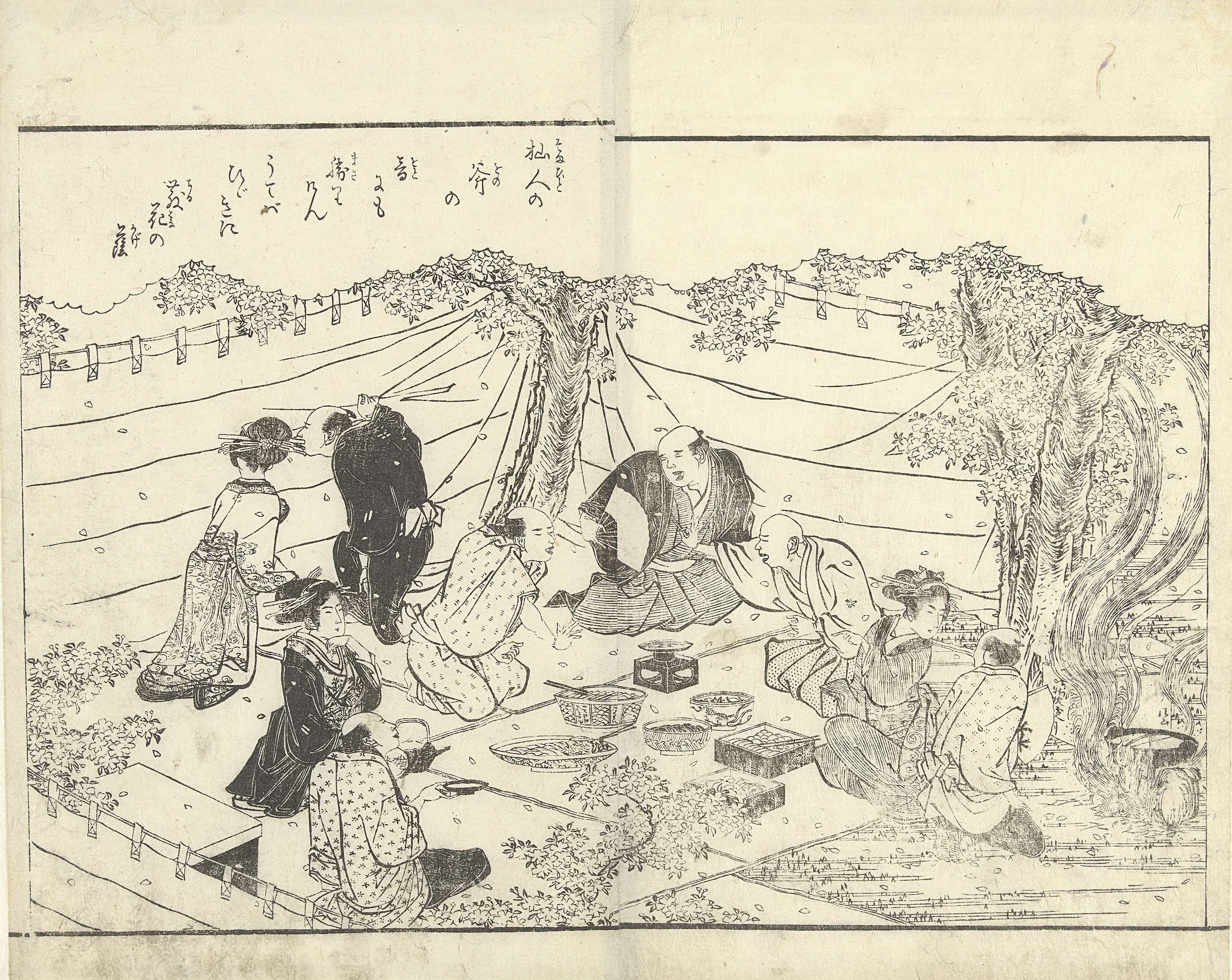 Mannen en vrouwen, tijdens een picknick onder een bloesemende boom, naar elkaar handgebaren makend. Twee pagina`s, aan elkaar geplakt, uit een Japans boek.