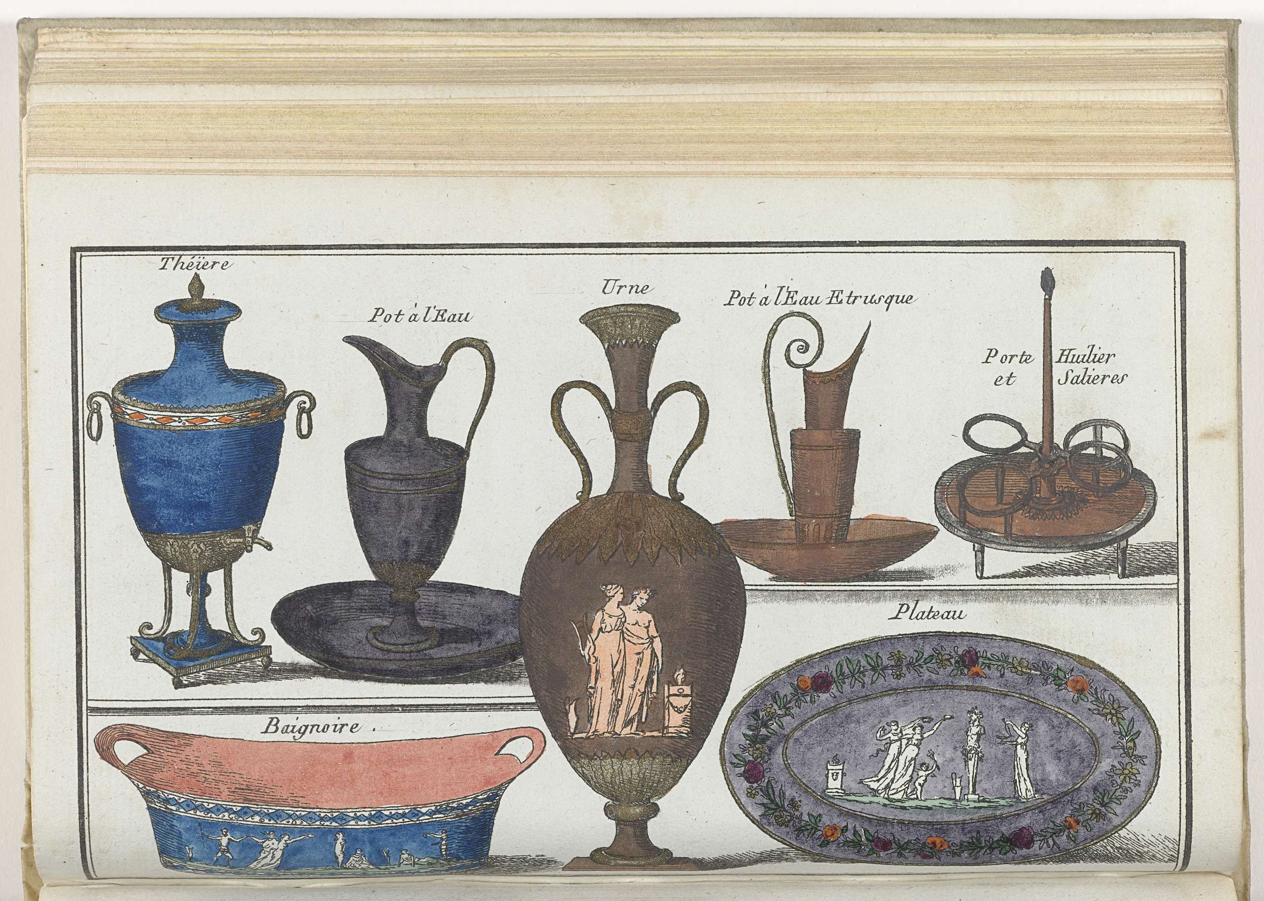 Voorbeelden van vaatwerk: Theiere, Pot a 'L'eau, Urne, Pot a l'Eau Etrusque.....Plateau. Prent uit het tijdschrift Le Mois : Journal historique, littéraire et critique avec figures, An 7 en 8 (1798-1800).