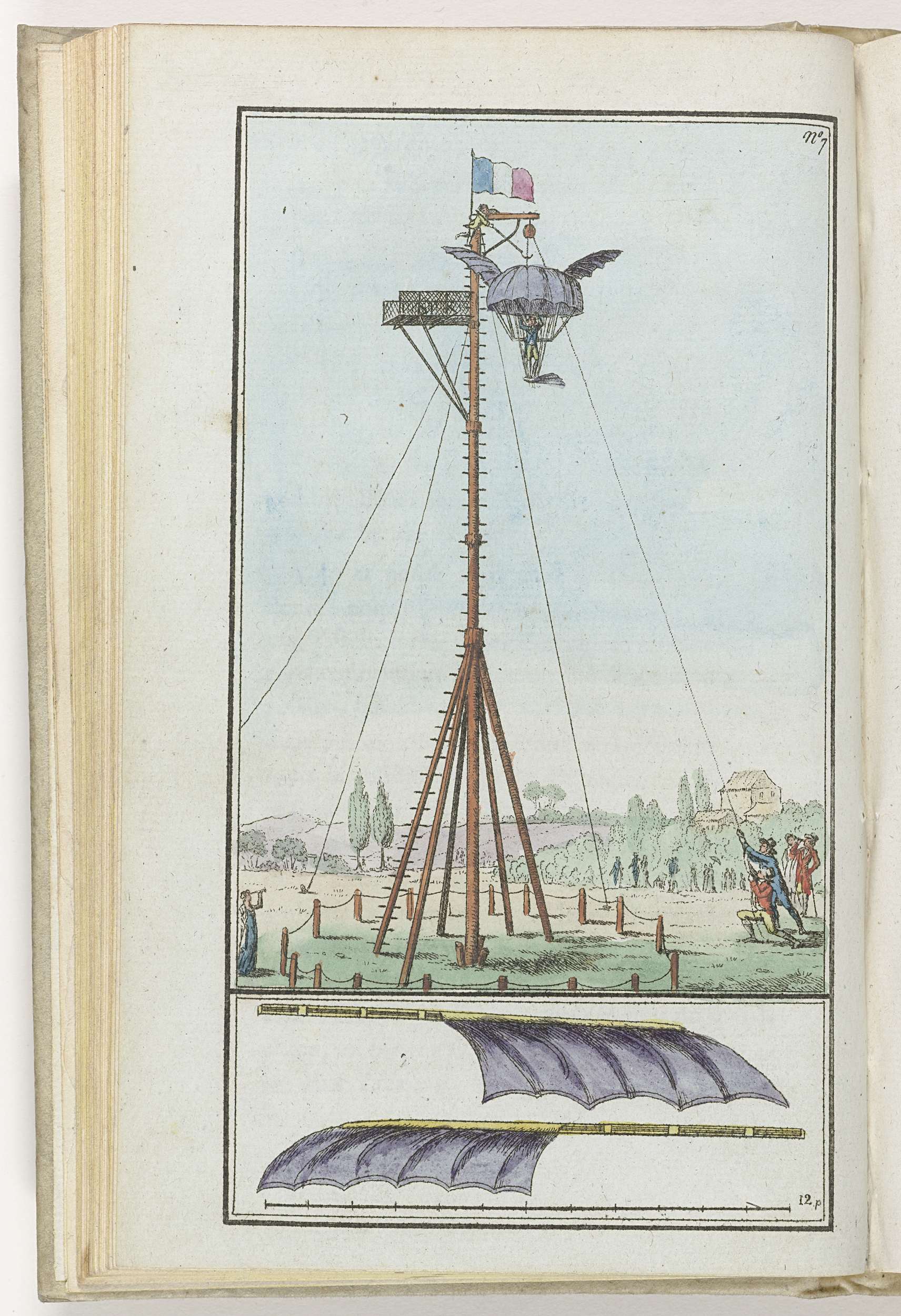 Houten staketsel met gevleugelde parachute waaraan een man hangt, klaar voor de sprong. Prent uit het tijdschrift Le Mois : Journal historique, littéraire et critique avec figures, An 7 en 8 (1798-1800).