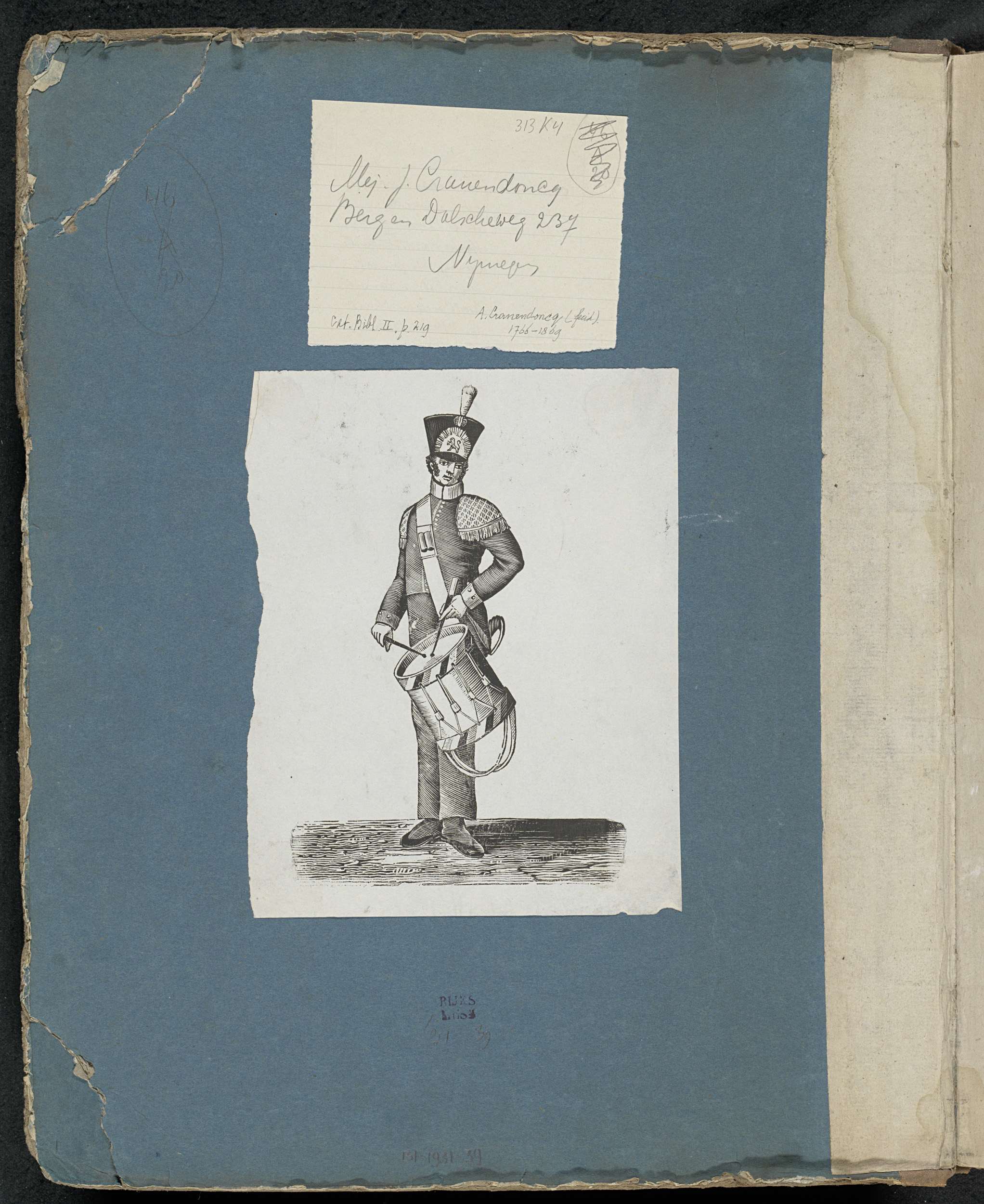 Dekblad van album met adresnotitie en voorstelling van een soldaat