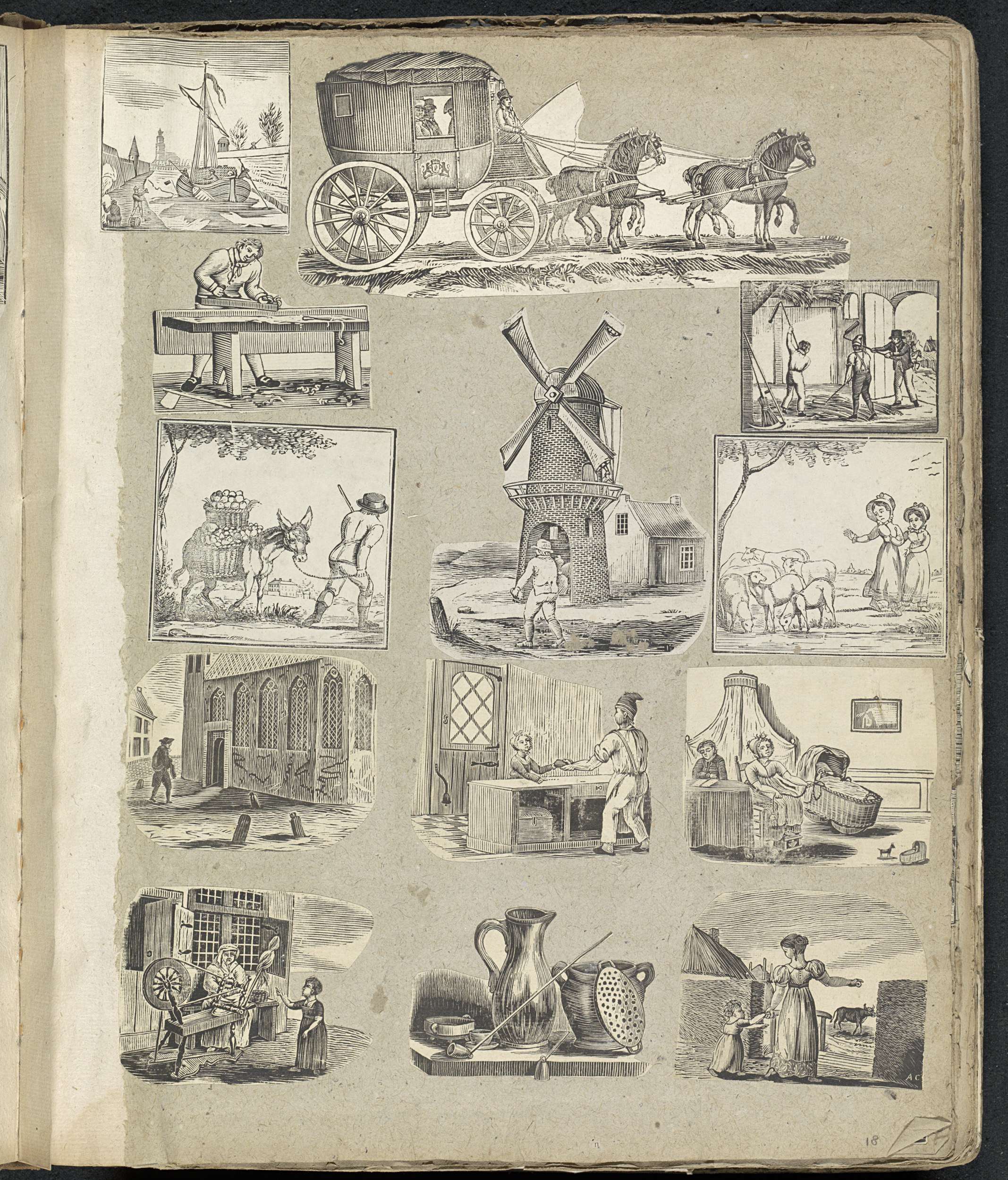 Albumblad met 13 uitgeknipte voorstellingen uit voornamelijk volksprenten, onder andere van een schip, een rijtuig en van verschillende beroepen en ambachtslieden.