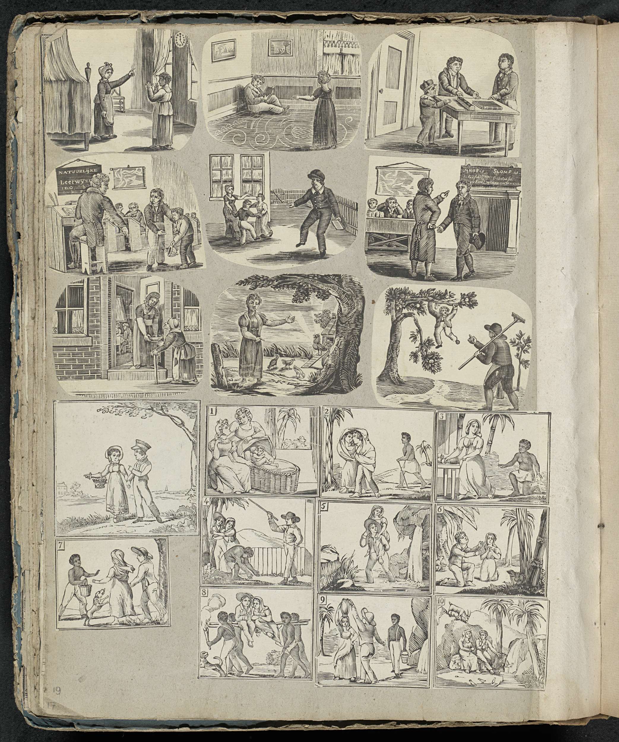 Albumblad met 20 uitgeknipte voorstellingen uit voornamelijk volksprenten, onder andere van het straffen van stoute kinderen, een boerin en haar kippen en voorstellingen uit het verhaal van een tweeling die leeft in de jungle.