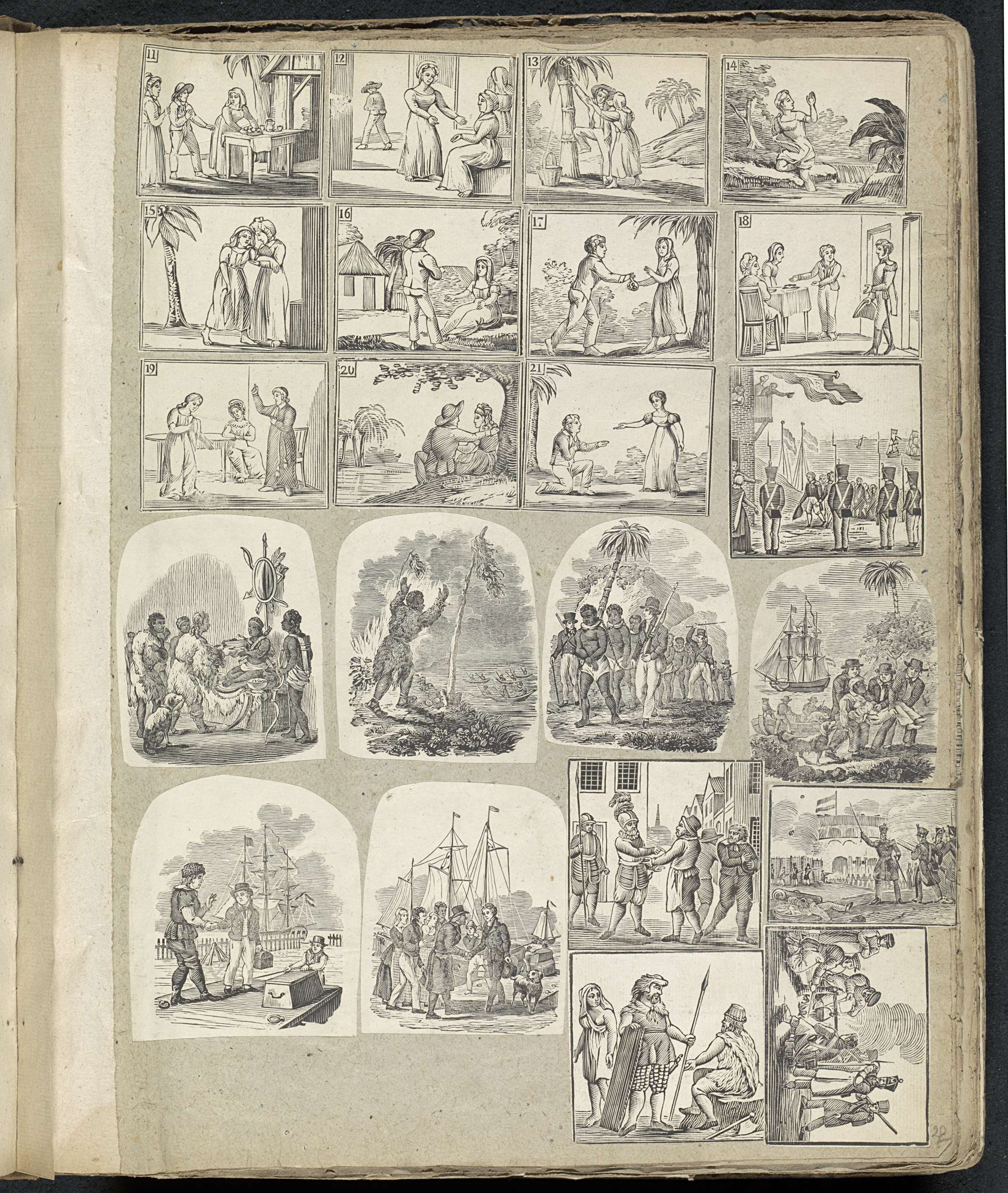 Albumblad met 22 uitgeknipte voorstellingen uit voornamelijk volksprenten, onder andere uit het verhaal van een tweeling die leeft in de jungle, van een ontdekkingsreis en van soldaten rond een vuur.