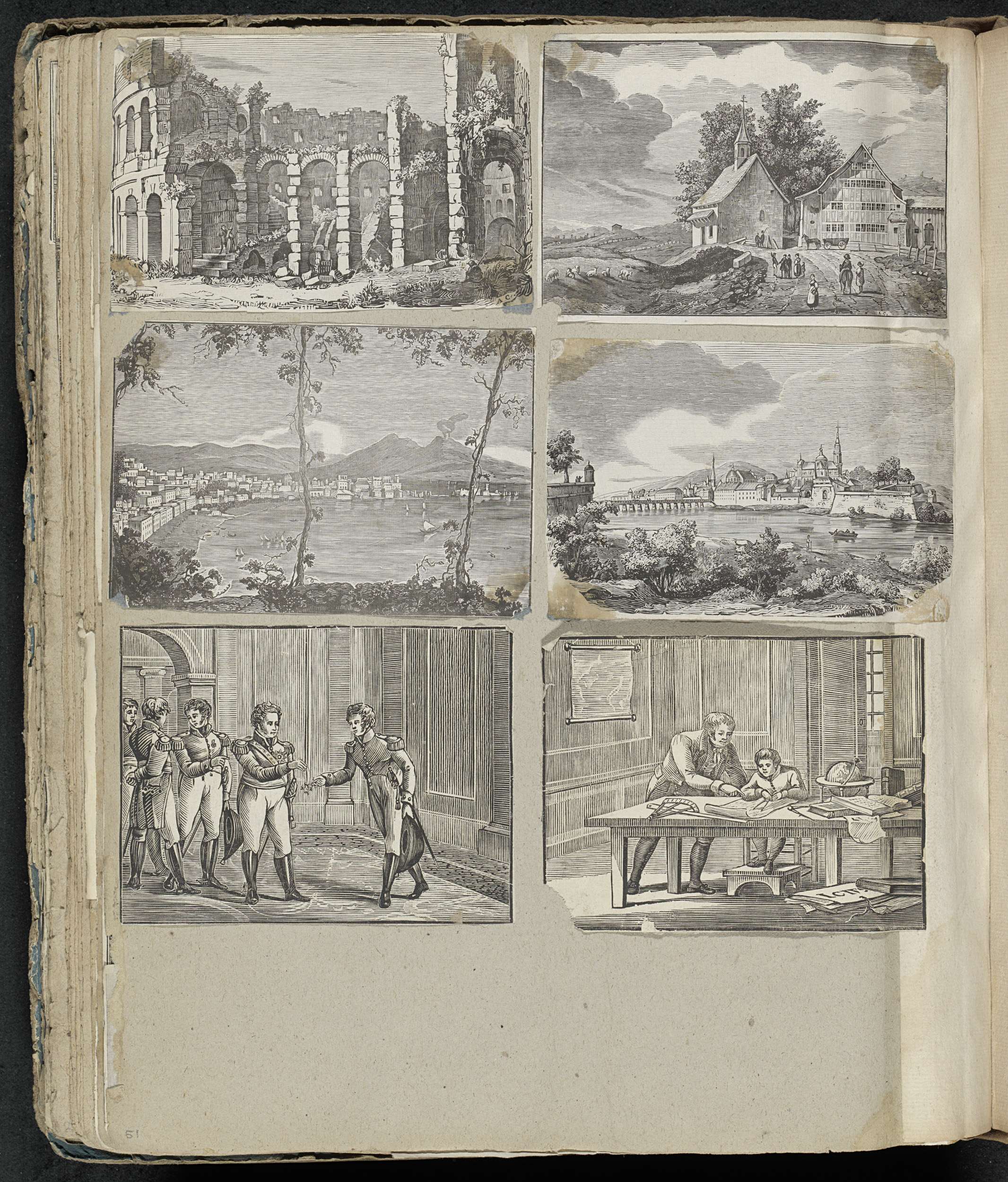 Albumblad met 6 uitgeknipte voorstellingen uit voornamelijk volksprenten, van onder andere het Colloseum, landschappen met stadsgezichten en militairen.