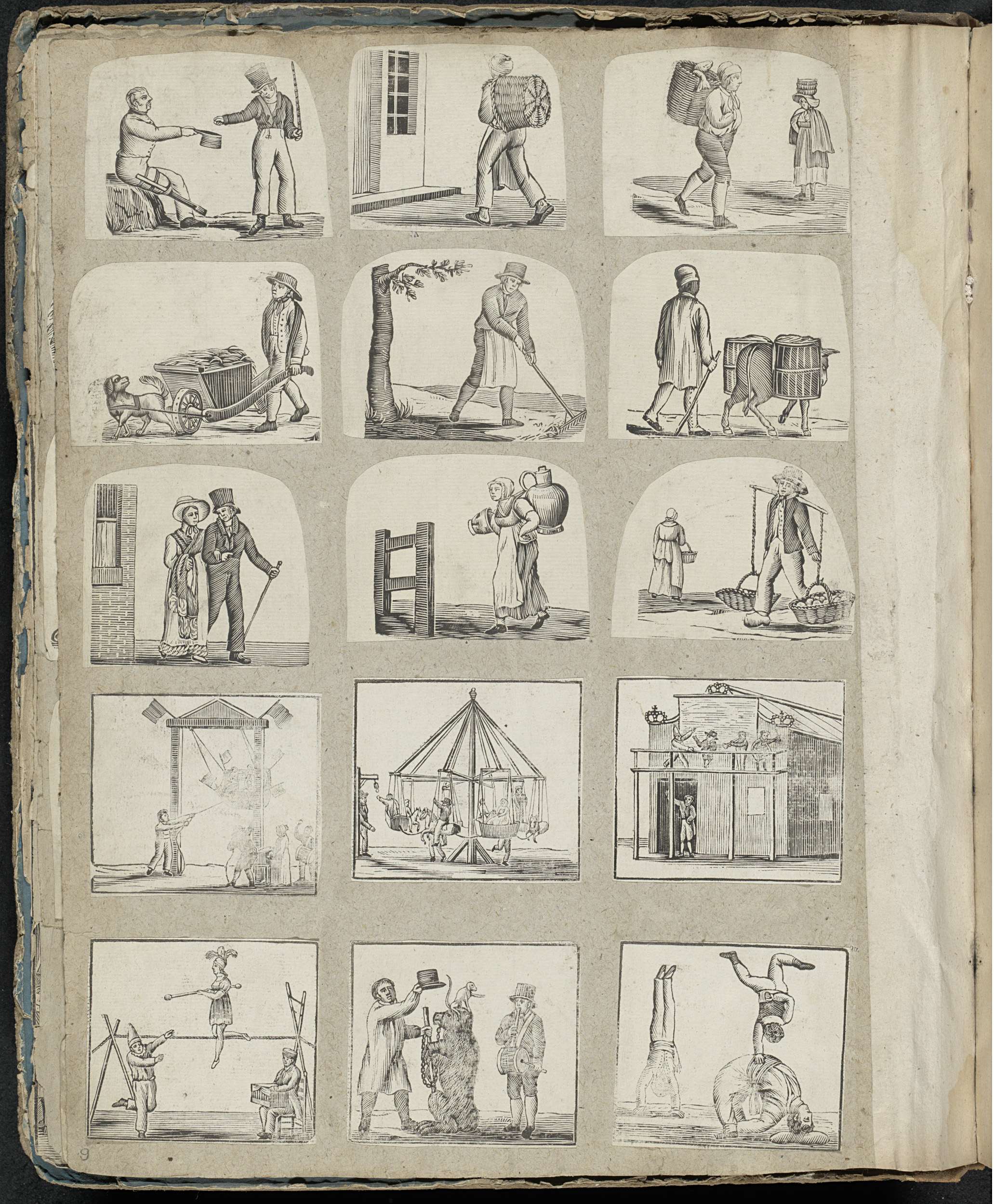 Albumblad met 15 uitgeknipte voorstellingen uit voornamelijk volksprenten, onder andere van beroepen, bezigheden en kermistaferelen.
