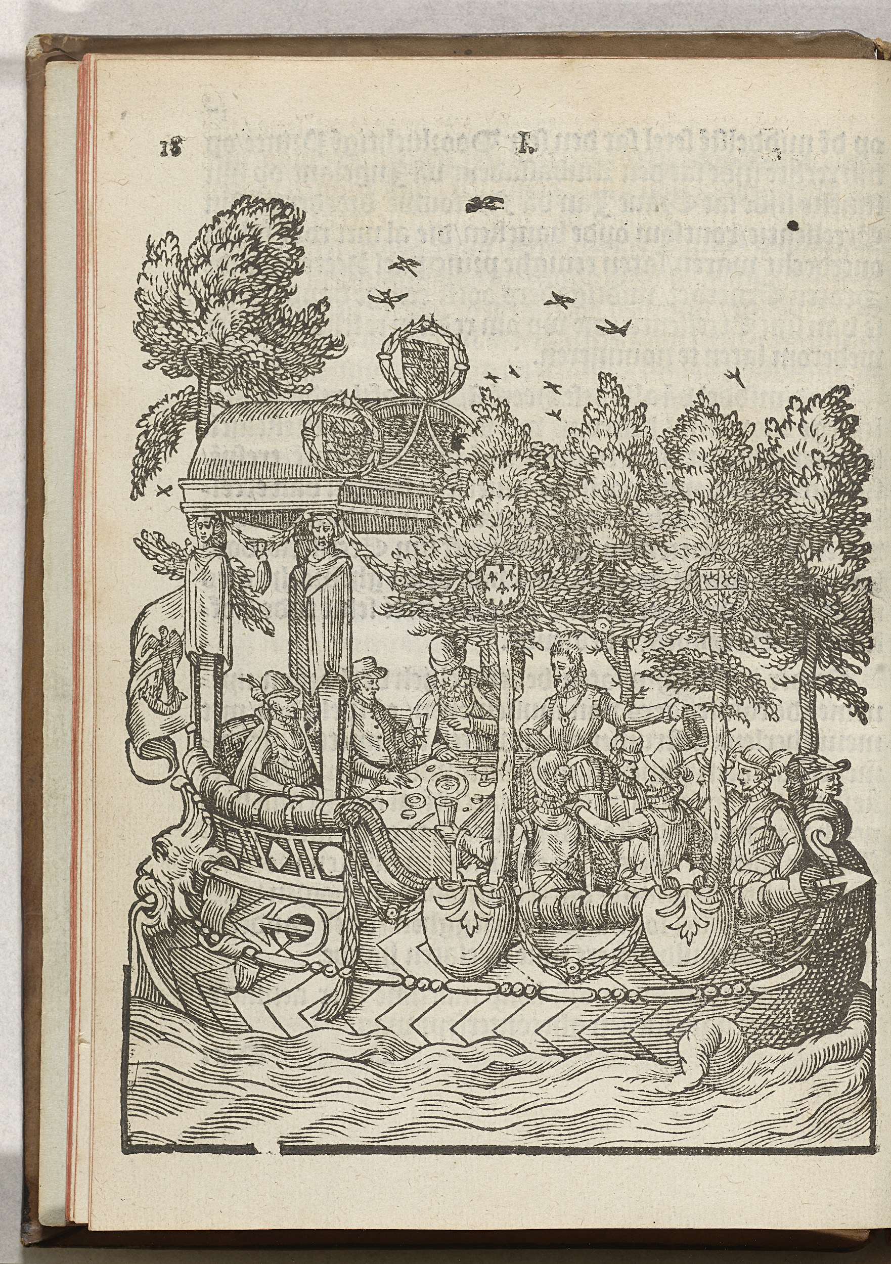 De prins vaart in het schip door de Nieuwe Vaart te Brussel. De prins gezeten aan een tafel in een boot versierd met takkengroen of bomen en wapenschilden. Onderdeel van de intocht van Willem van Oranje te Brussel, 18 september 1577.