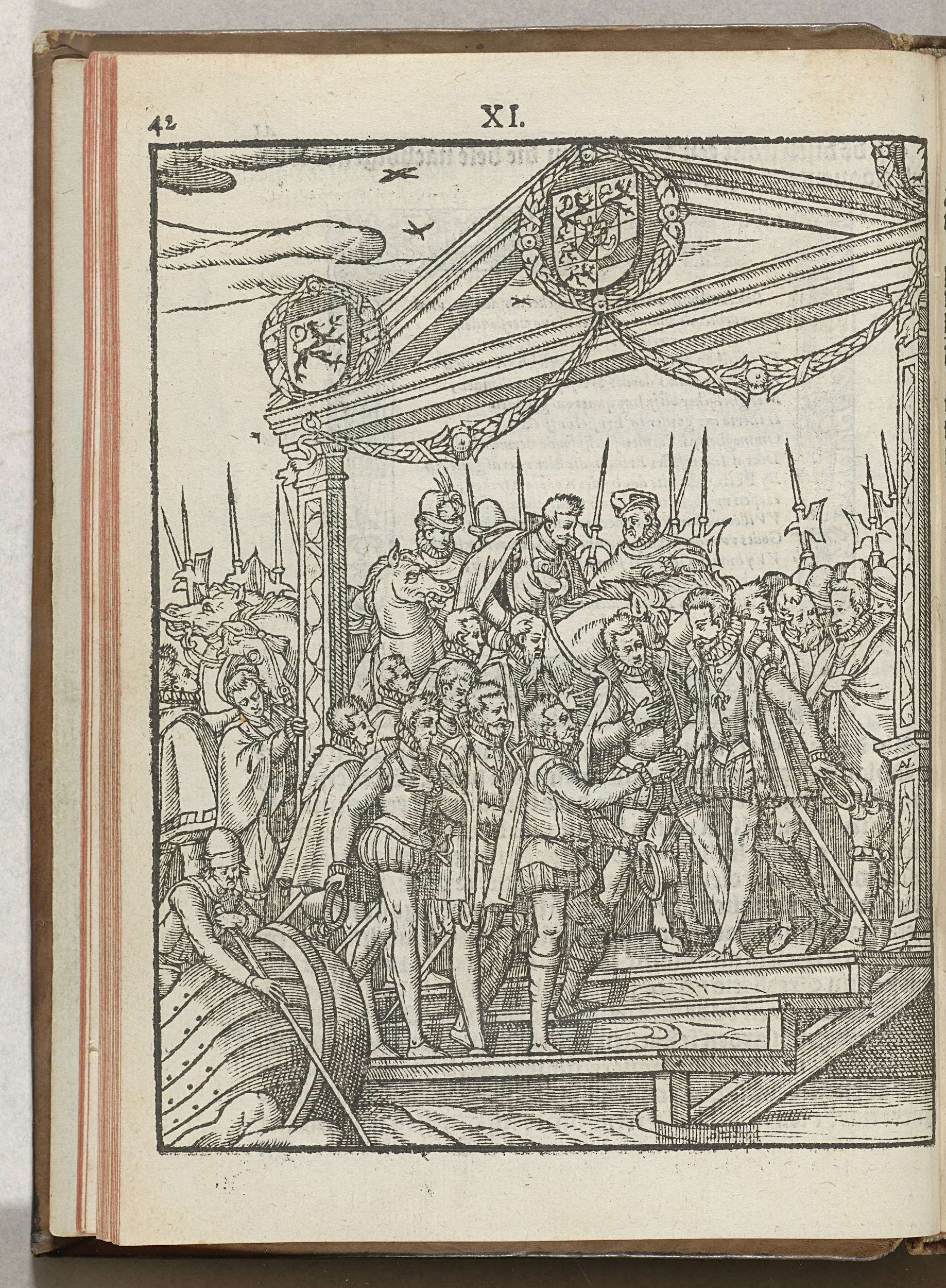 De prins van Oranje verwelkomd door de hertog van Aarschot, op de trappen van de landingsplaats. Onderdeel van de intocht van Willem van Oranje te Brussel, 18 september 1577.