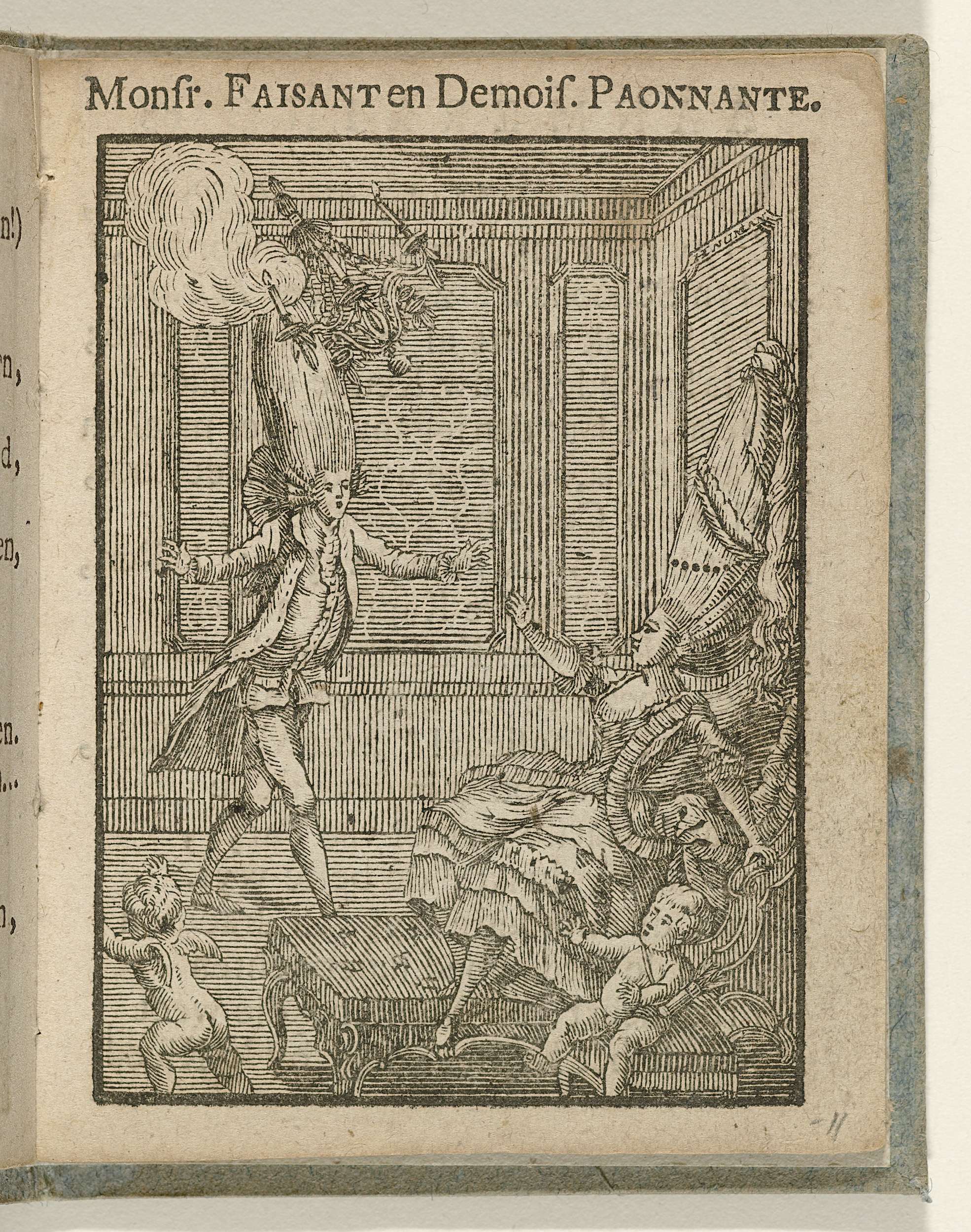 P. 11 van boekje waarin de Parijse mode van de overdreven hogekapsels wordt bespot:. De verliefde minnaar let niet op waar hij loopt, zodat zijn hoge kapsel vlam vat in de kroonluchter.