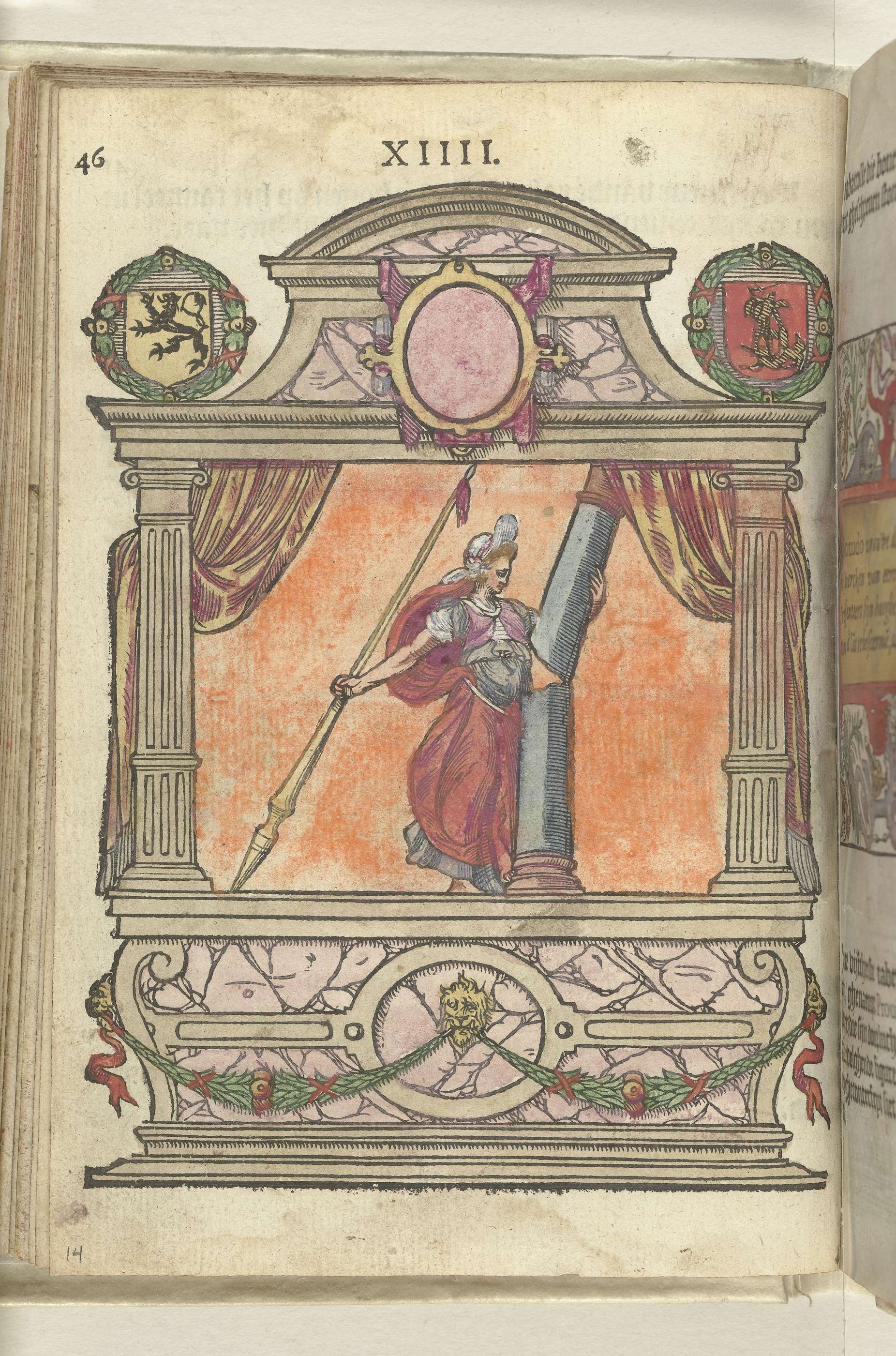 Toneel met personificatie van de Kracht (Fortitudo). Op de tegenoverliggende bladzijde een cartouche met het vers dat boven het toneel stond. Toneelvoorstelling tijdens de intocht van Matthias te Brussel, 18 januari 1578.