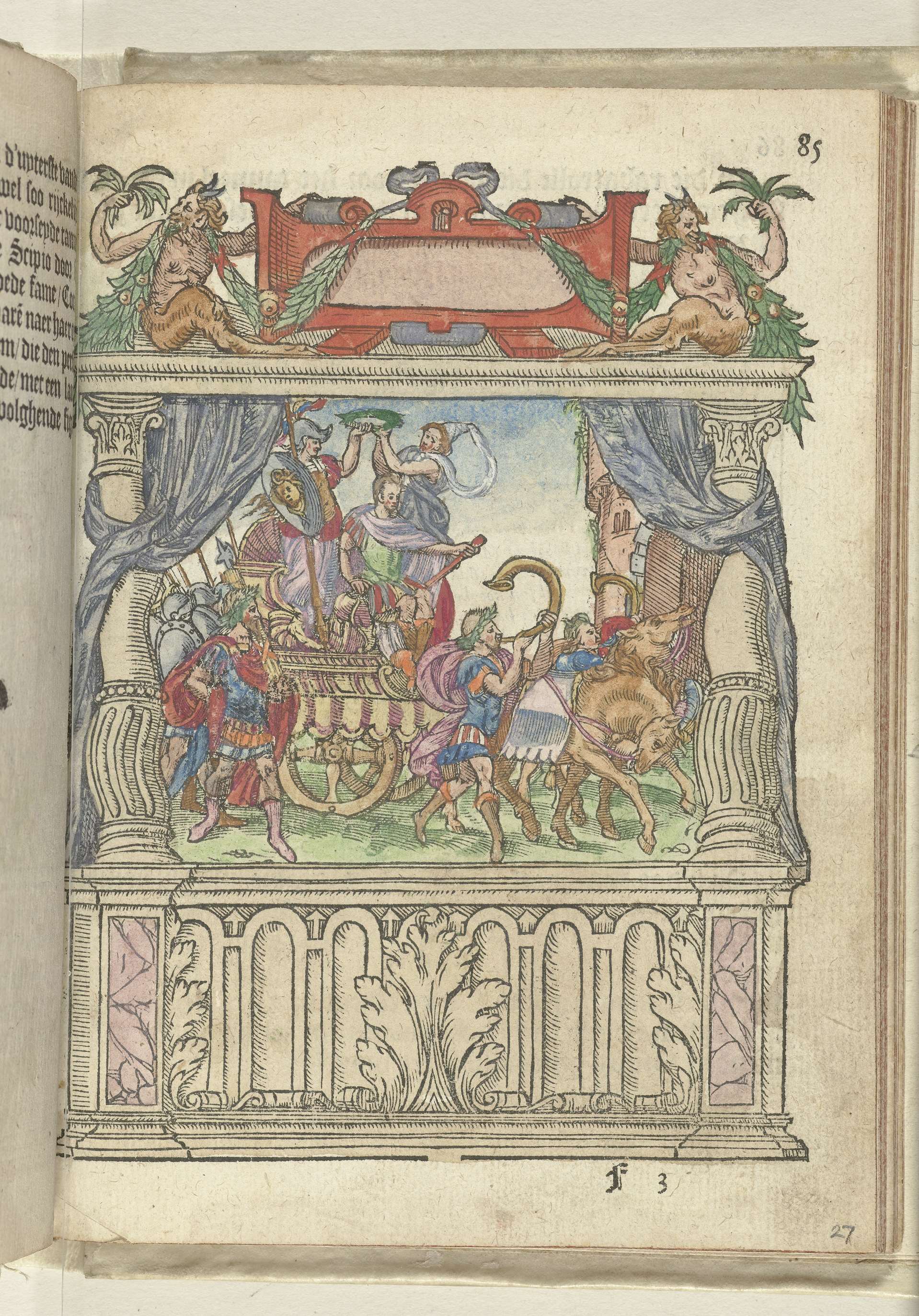 Allegorische voorstelling op het toneel aan het eind van de Steenweg. Episode uit het verhaal van Scipio, 1578. Toneelvoorstelling tijdens de intocht van Matthias te Brussel, 18 januari 1578.