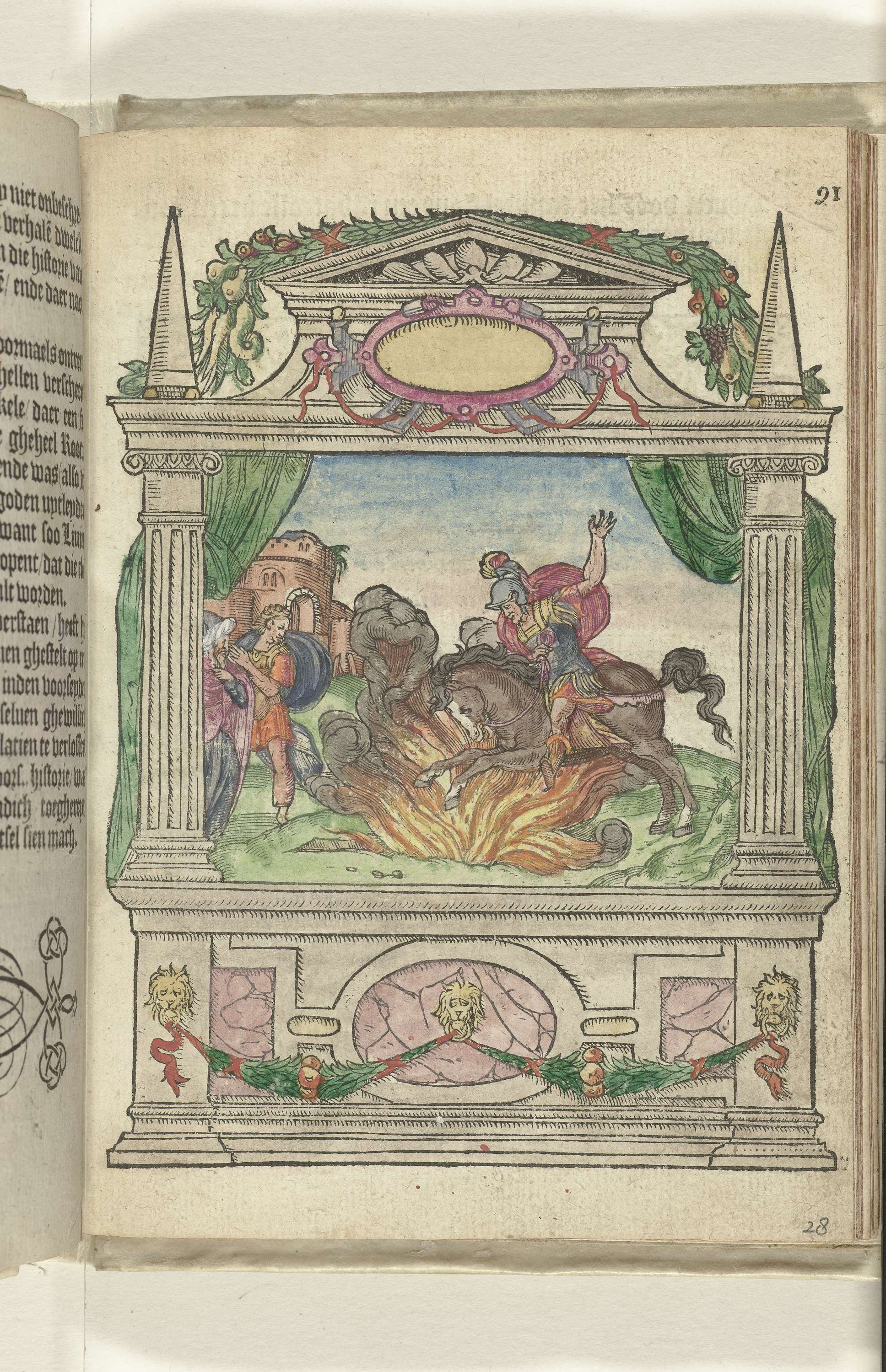Toneel met een voorstelling van de heldendaad van Marcus Curtius, 1578. Toneelvoorstelling tijdens de intocht van Matthias te Brussel, 18 januari 1578.