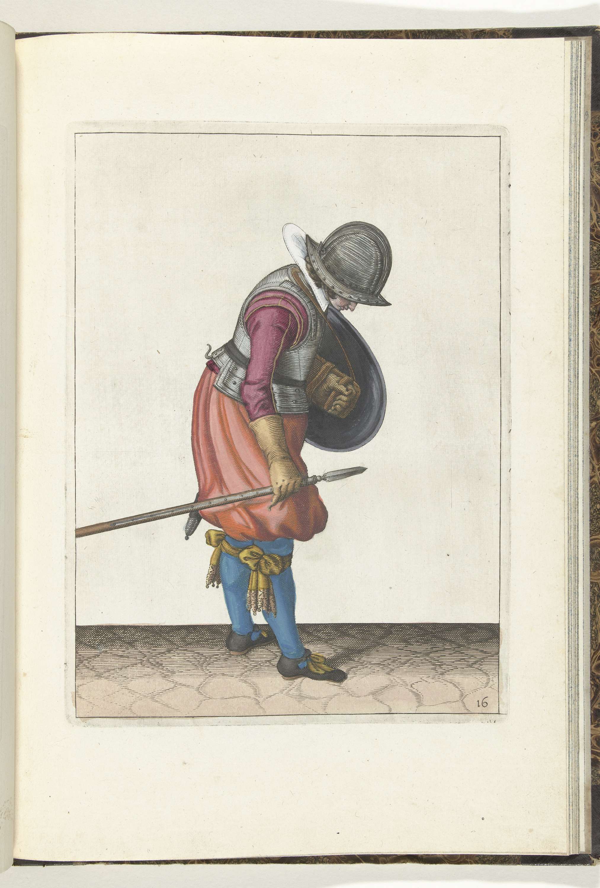 De exercitie met schild en spies: de soldaat legt de spies naast zijn rechtervoet op de grond (nr. 16), 1618
