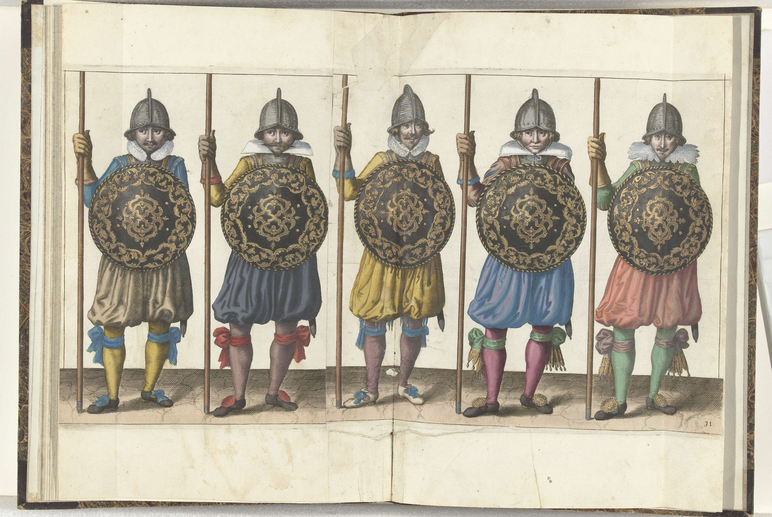 De exercitie met schild en spies: vijf soldaten staande naast elkaar in het gelid met de spies in de rechterhand rustend op de grond en het schild voor de borst (nr. 31), 1618