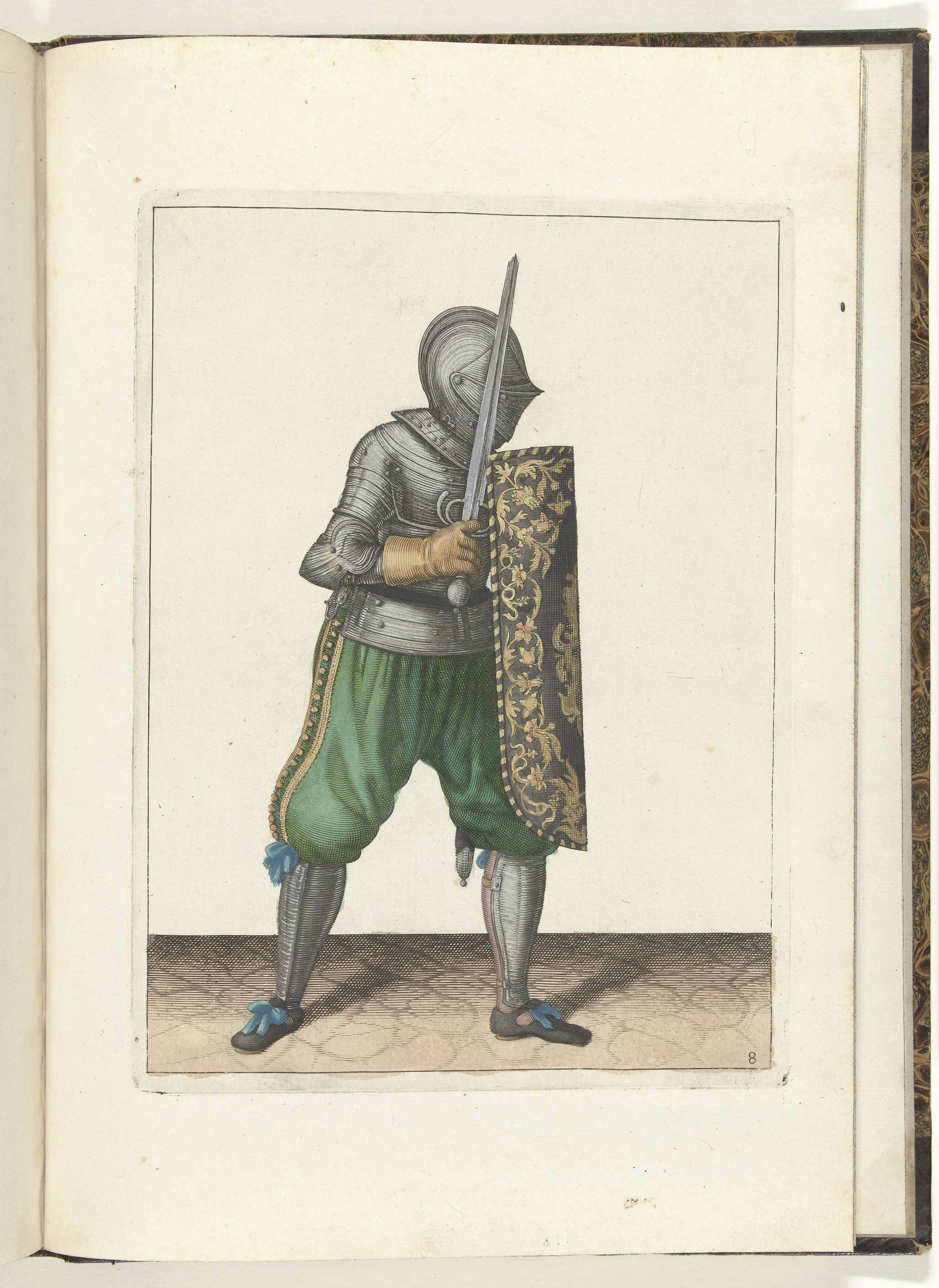 De exercitie met de targe en rapier: hoe de soldaat zich moet verdedigen met de targe rustend tegen de linkerknie en linkerschouder, de getrokken rapier in de hand (nr. 8), 1618