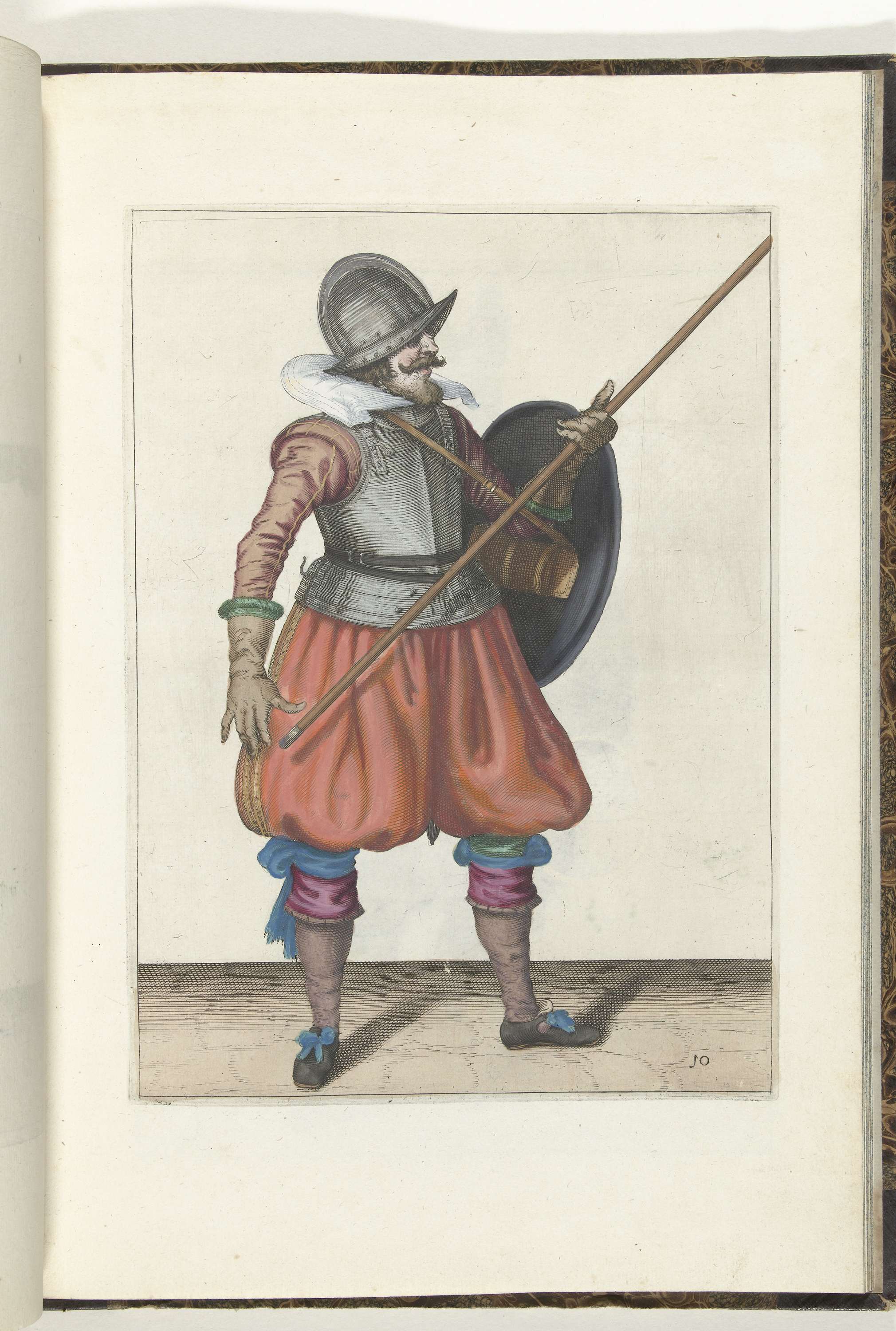 De exercitie met schild en spies: de soldaat brengt in drie tijden de spies weer terug in de rustpositie, eerste beweging, 1618. Onderdeel van de illustraties in: Adam van Breen, Nassauische Waffenhandelung, 1618, plaat nr. 10. Krijgswezen rond 1600.