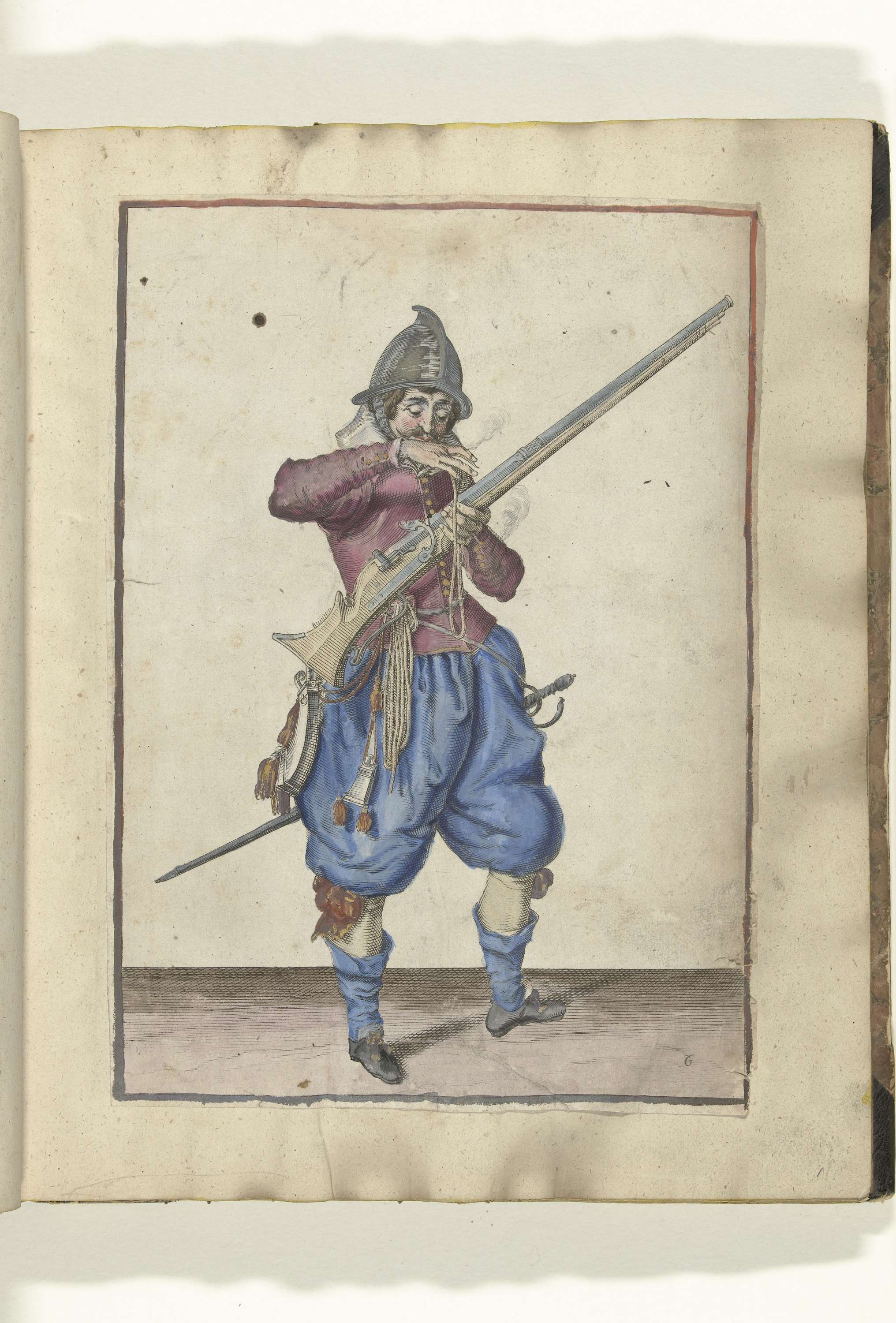 Een soldaat, ten voeten uit, naar rechts, die een roer (een bepaald type vuurwapen) met zijn linkerhand vasthoudt (nr. 6), ca. 1600. Met zijn rechterhand brengt hij een brandende lont naar zijn mond om hem schoon te blazen. Plaat 6 in de instructies voor het hanteren van de roer: Shorte instruction upon the contrefaictinges, touching ...