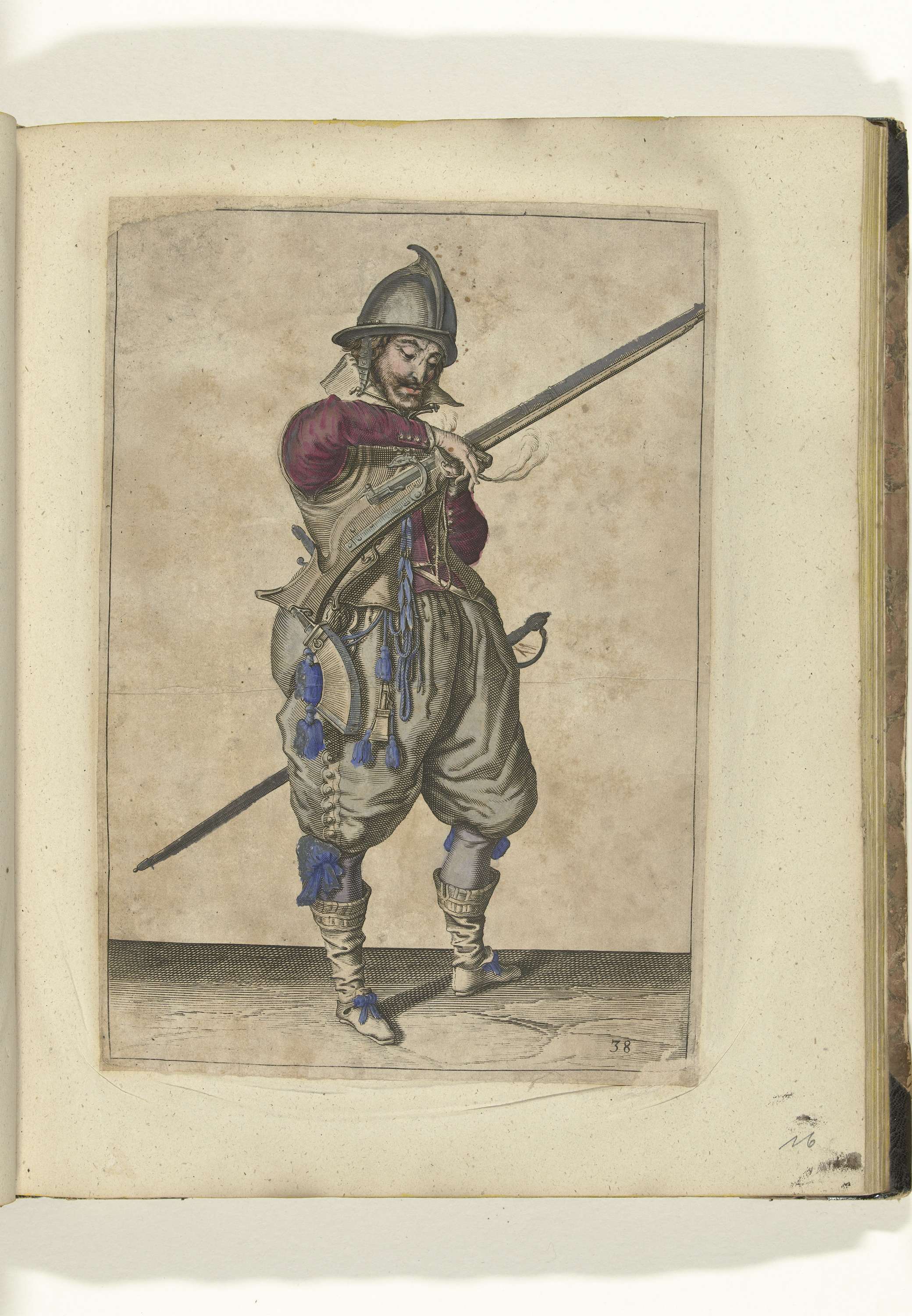 Een soldaat op wacht, ten voeten uit, naar rechts, die een roer (een bepaald type vuurwapen) met zijn linkerhand vasthoudt. In zijn linkerhand behalve het roer ook een brandende lont (nr. 38), ca. 1600. Met zijn rechterhand pakt hij deze lont. Het gaat dus om dezelfde positie als degene die op de vijfde prent van ...