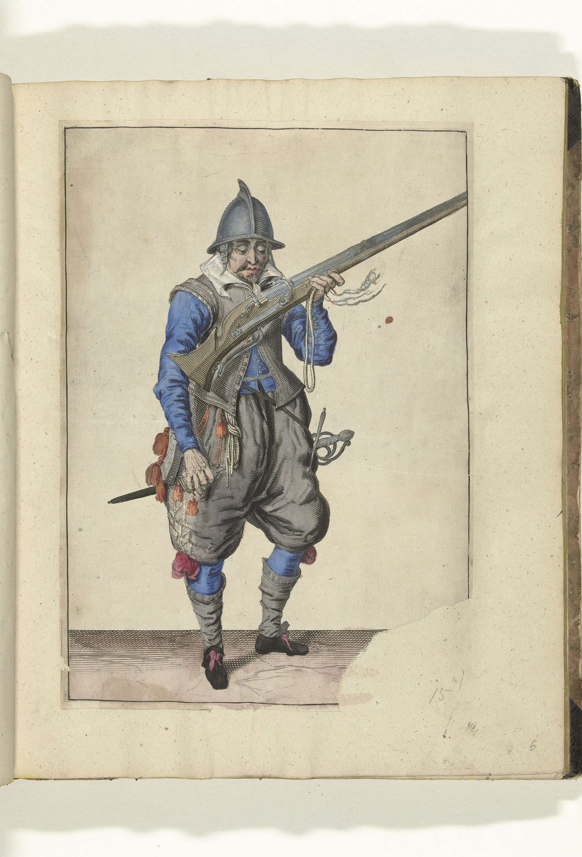 Een soldaat, ten voeten uit, naar rechts, die een roer (een bepaald type vuurwapen) bij zijn mond houdt en over de pan (het kruitreservoir) blaast (nr. 15), ca. 1600. In zijn linkerhand behalve het roer ook een brandende lont. In zijn rechterhand een kruitfles. Plaat 15 in de instructies voor het hanteren van de roer: ...