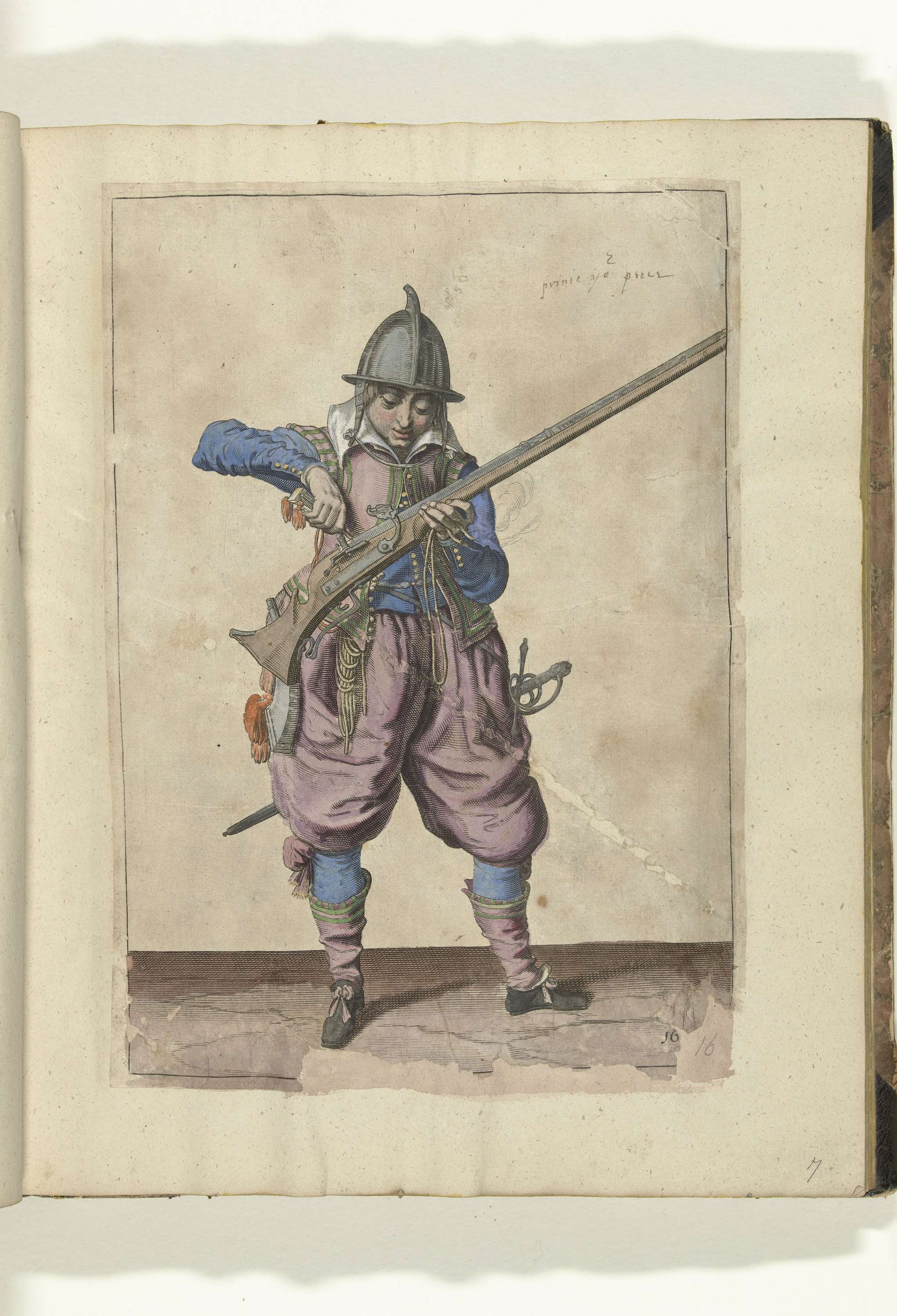 Soldaat die kruit in de pan van zijn roer giet (nr. 16), ca. 1600
