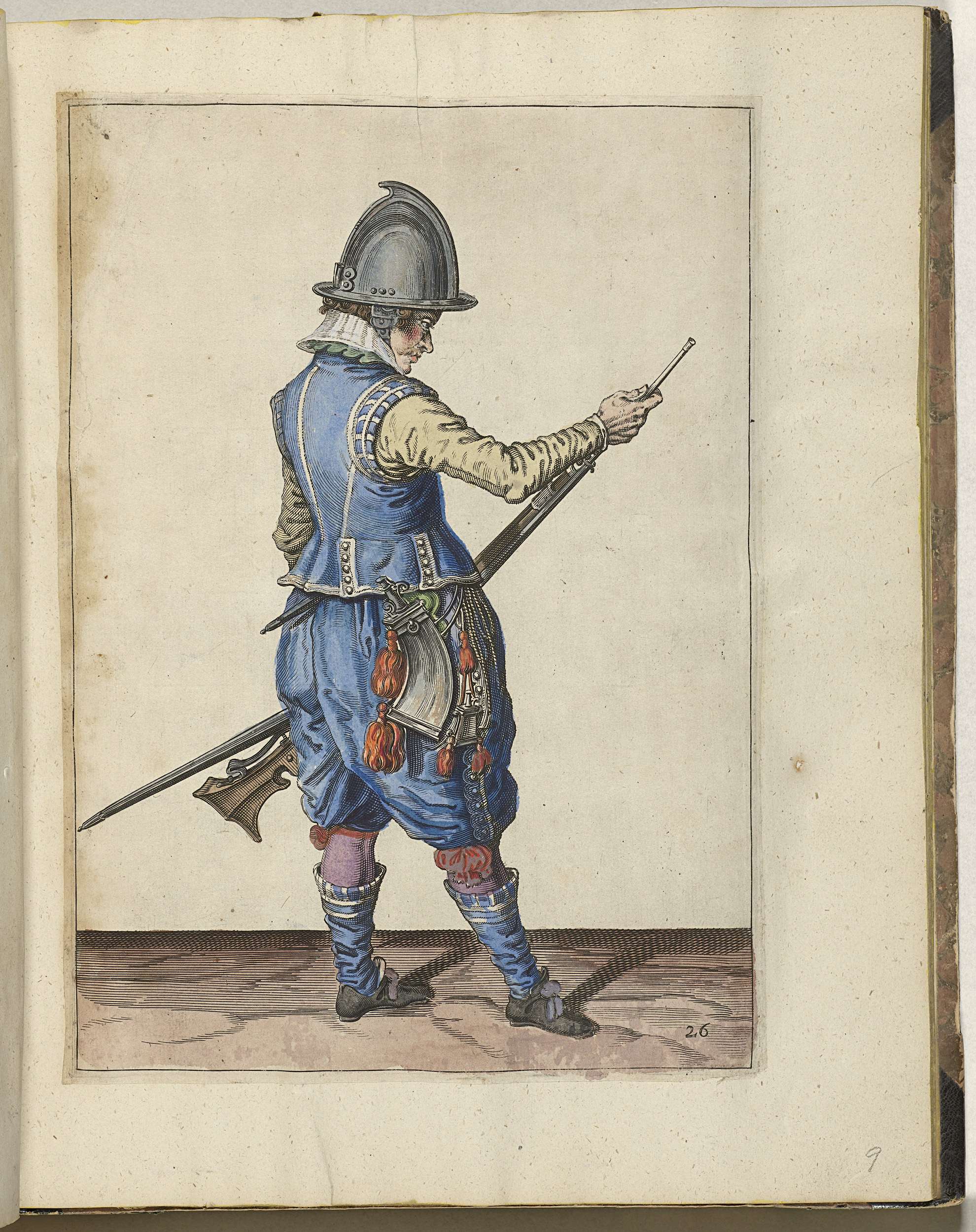Een soldaat, ten voeten uit, naar rechts, die met zijn linkerhand bij zijn linkerdijbeen een roer (een bepaald type vuurwapen) vasthoudt en met zijn rechterhand zijn laadstok in de loop brengt, om kruit en kogel aan te duwen (nr. 26), ca. 1600. Plaat 26 in de instructies voor het hanteren van de roer: Shorte instruction ...
