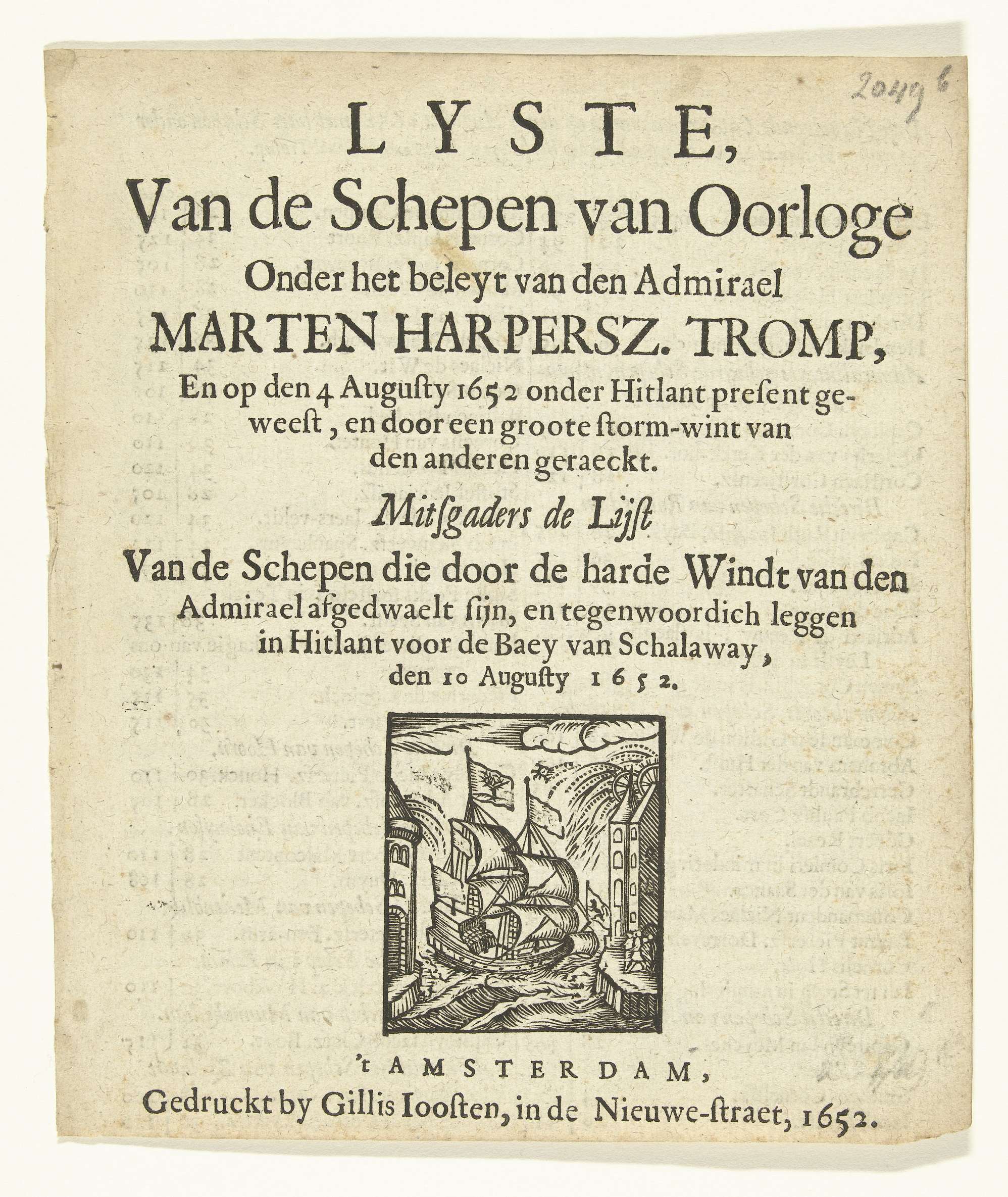 Pamflet met lijsten van de oorlogsschepen die op 4 en 10 augustus van de Staatse vloot onder Maarten Tromp gescheiden zijn geraakt, 1652. Een deel van de vloot ligt voor anker in de Shetland eilanden (Hitland). Pamflet van 4 bladzijden, op de voorzijde een vignet met het Haarlemse schip voor Damiate.