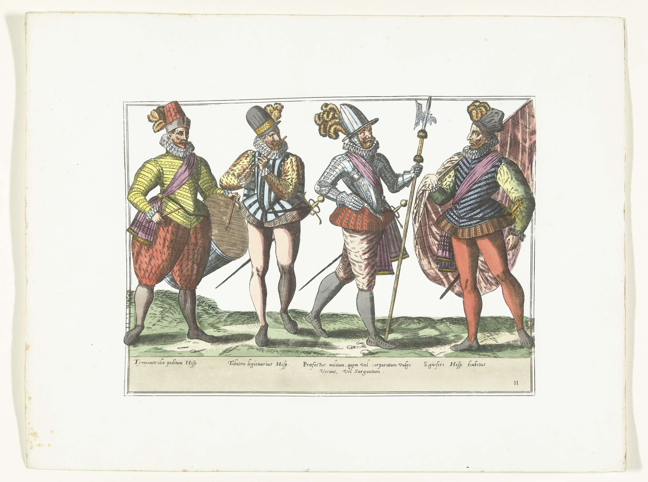 Vier Spaanse militairen in uniform, ca. 1580. Onderdeel van de serie Habitus Variarum Gentium, kostuumprenten in facsimile, planche 11.