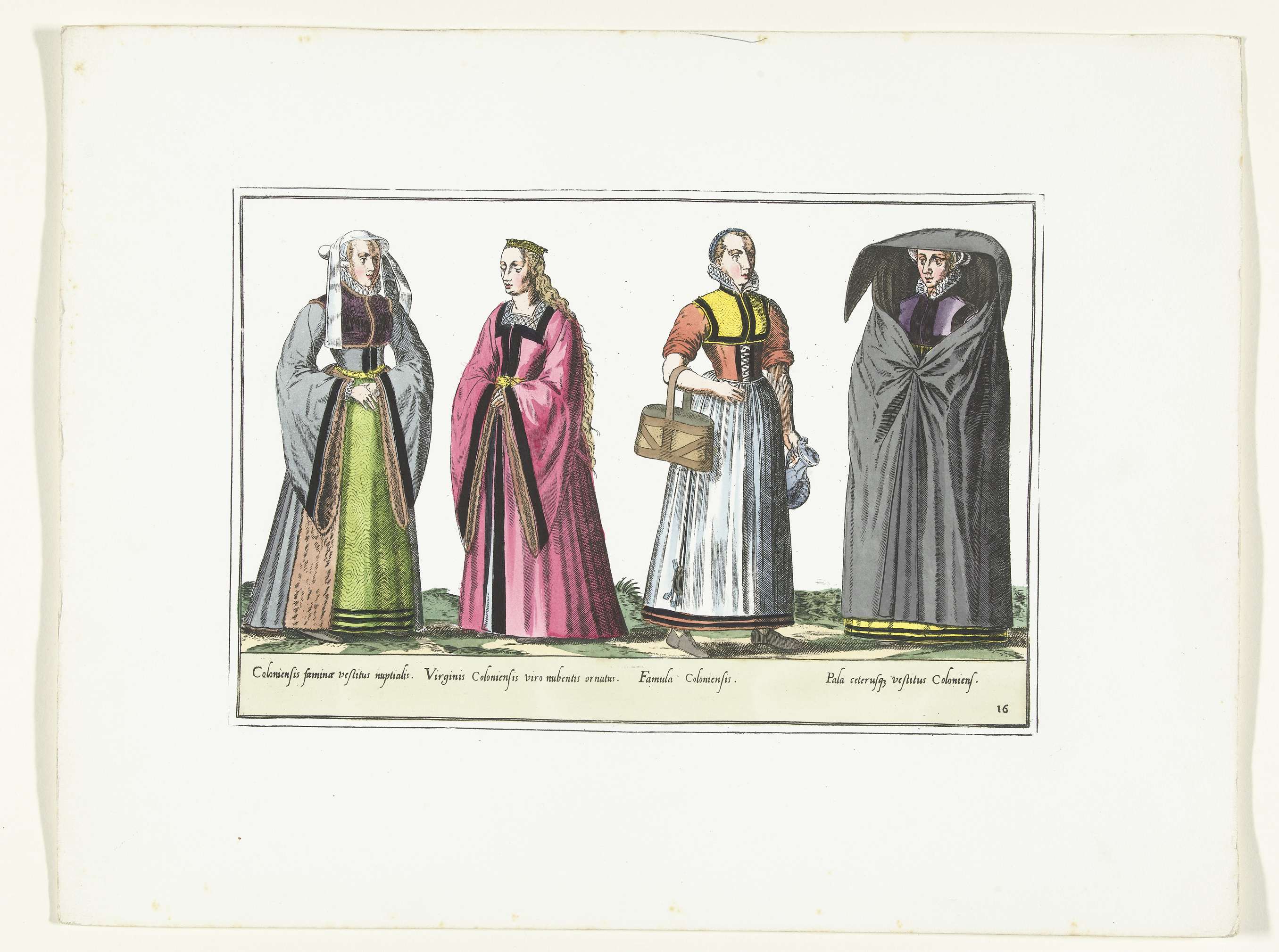 Vier vrouwen gekleed volgens de Duitse mode, ca. 1580. Onderdeel van de serie Habitus Variarum Gentium, kostuumprenten in facsimile, planche 16.
