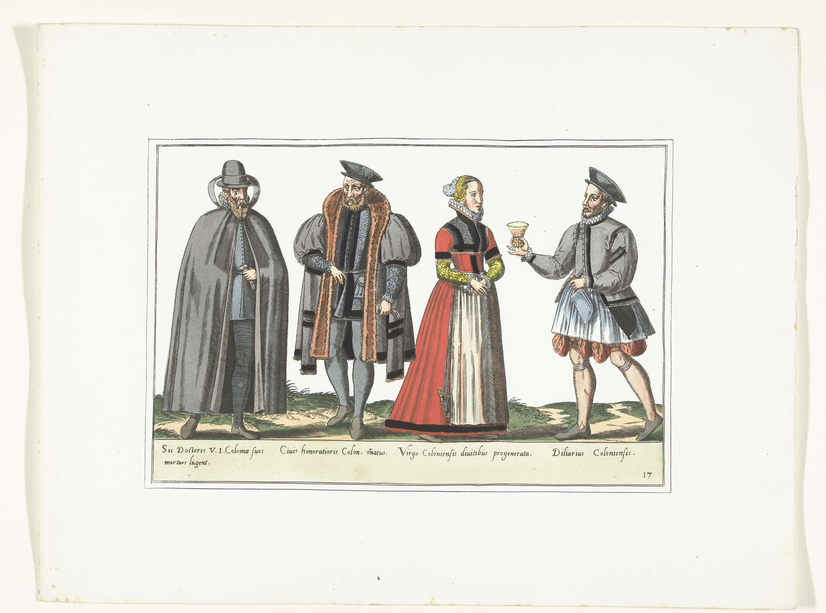 Drie mannen en een vrouw gekleed volgens de Duitse mode, ca. 1580. Onderdeel van de serie Habitus Variarum Gentium, kostuumprenten in facsimile, planche 17.