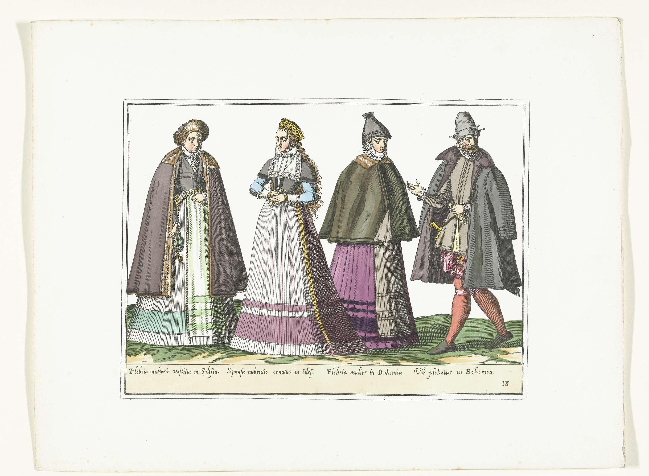 Drie vrouwen en een man gekleed volgens de Duitse mode in Silezië en Bohemen, ca. 1580. Onderdeel van de serie Habitus Variarum Gentium, kostuumprenten in facsimile, planche 18.