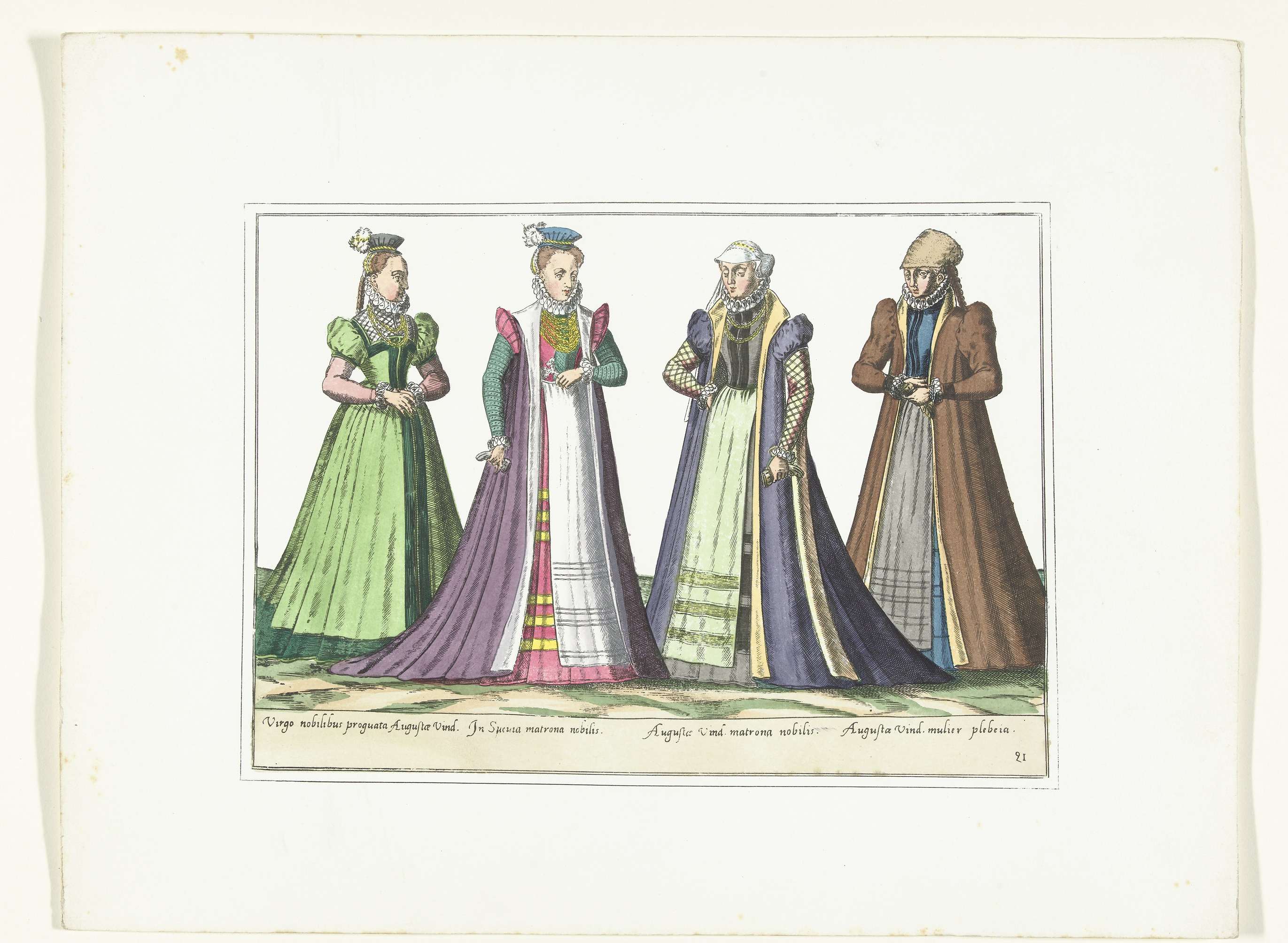 Vier vrouwen gekleed volgens de Duitse mode in Augsburg, ca. 1580. Onderdeel van de serie Habitus Variarum Gentium, kostuumprenten in facsimile, planche 21.