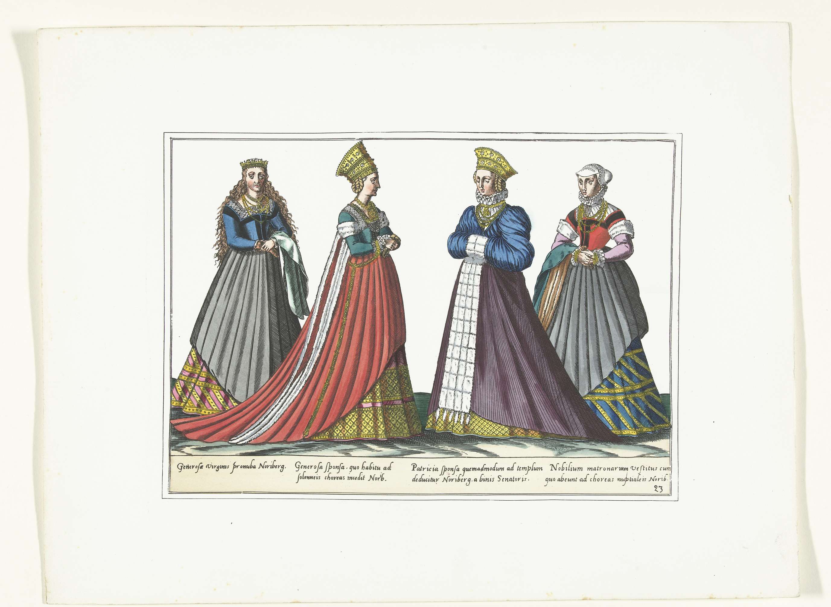 Vier vrouwen gekleed volgens de Duitse mode in Neurenberg, ca. 1580. Onderdeel van de serie Habitus Variarum Gentium, kostuumprenten in facsimile, planche 23.