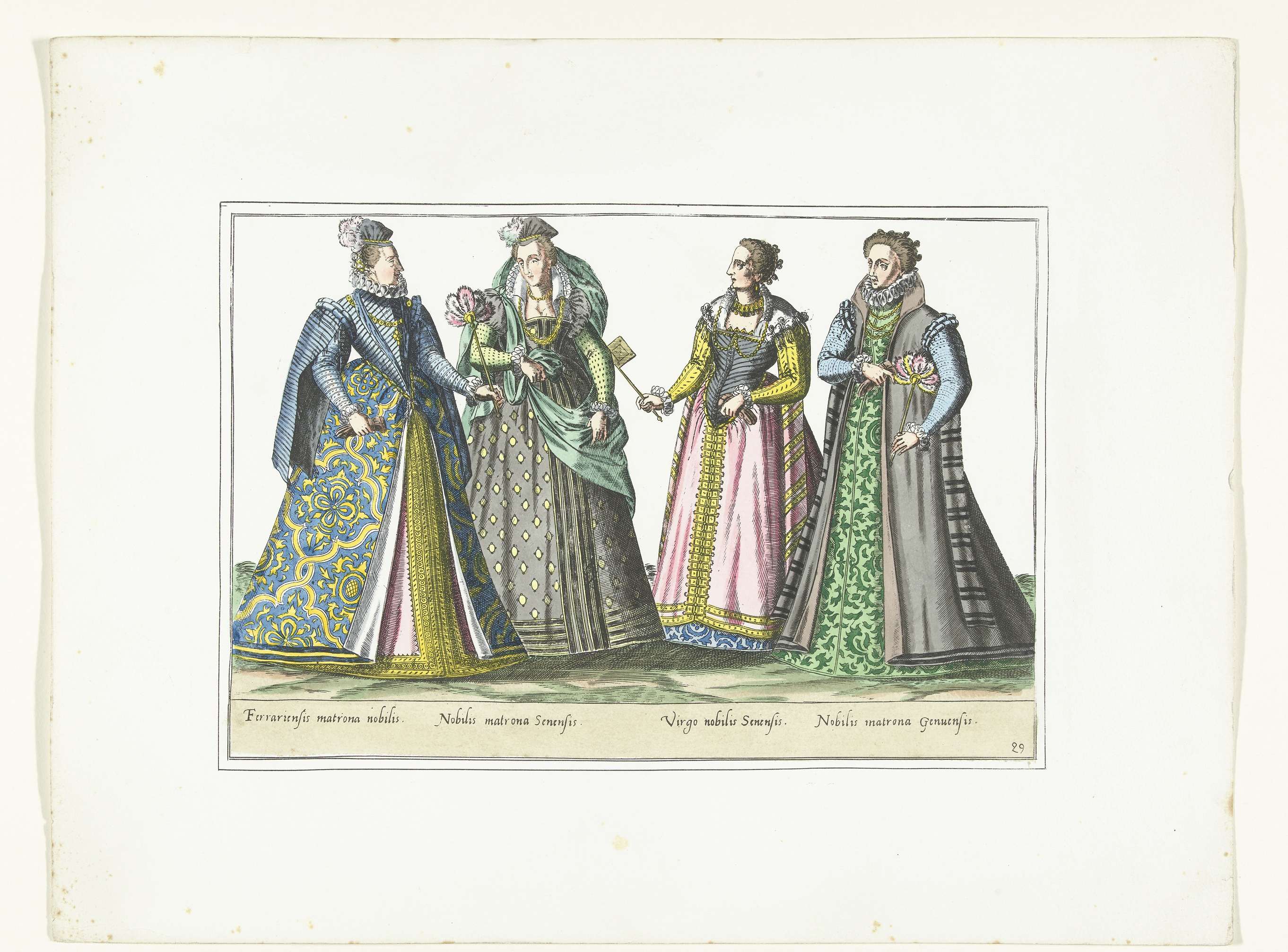 Vier vrouwen gekleed volgens de Italiaanse mode in Ferrara, Siena en Genua, ca. 1580. Onderdeel van de serie Habitus Variarum Gentium, kostuumprenten in facsimile, planche 29.