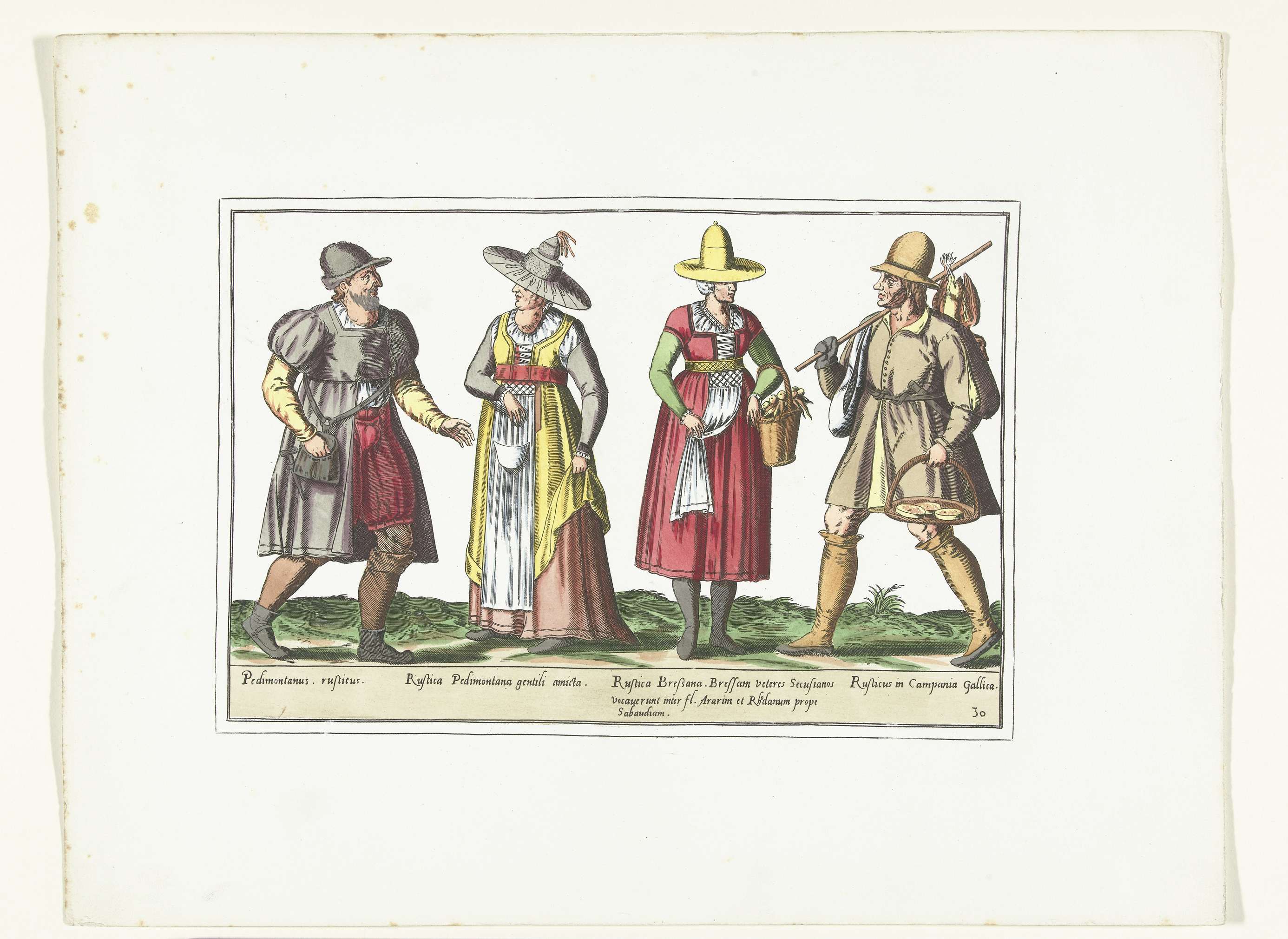 Twee boeren en twee boerinnen gekleed volgens de Italiaanse mode, ca. 1580. Onderdeel van de serie Habitus Variarum Gentium, kostuumprenten in facsimile, planche 30.