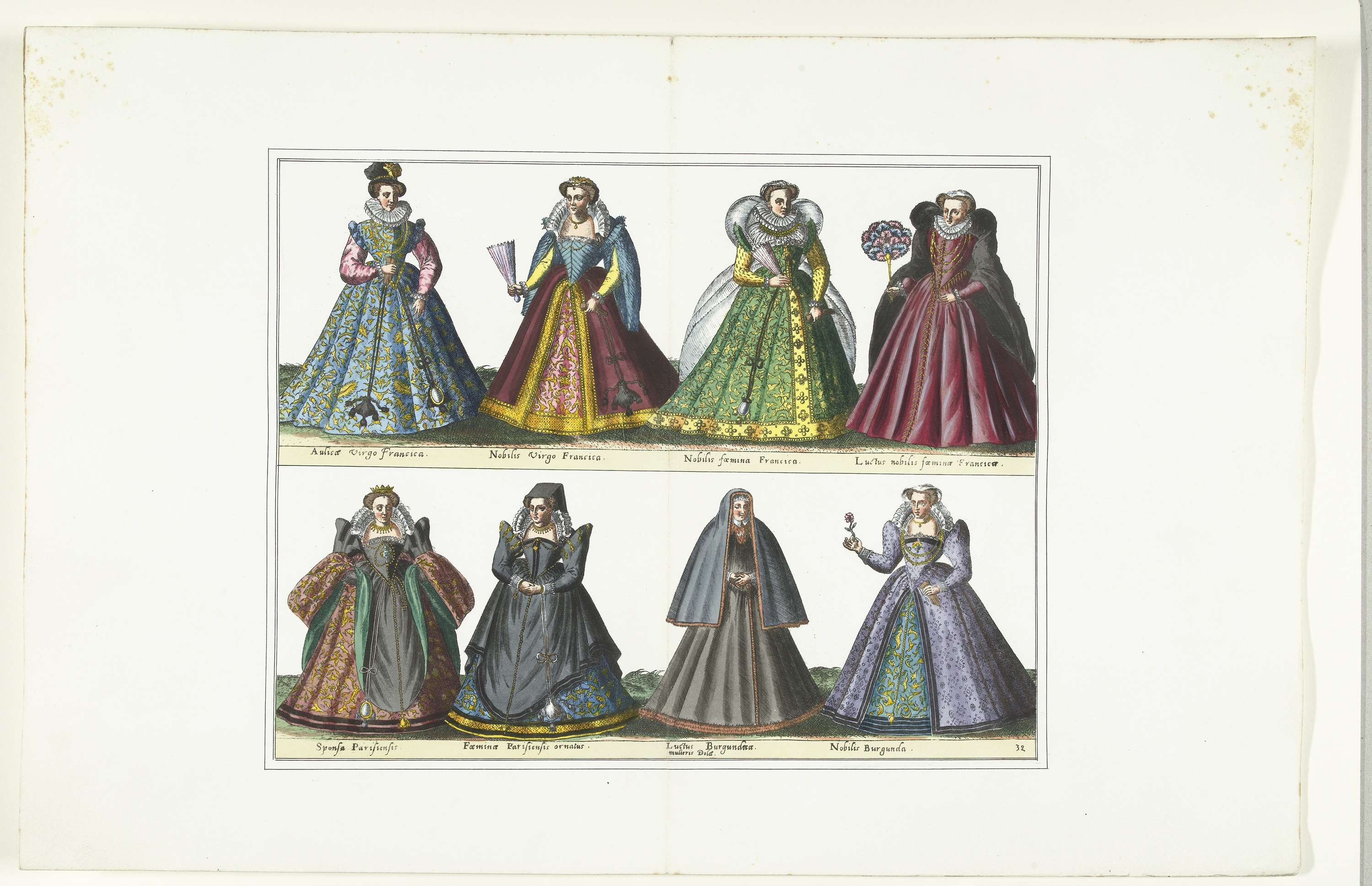 Dubbele plaat met acht vrouwen gekleed volgens de Franse mode, ca. 1580. Onderdeel van de serie Habitus Variarum Gentium, kostuumprenten in facsimile, planche 32.