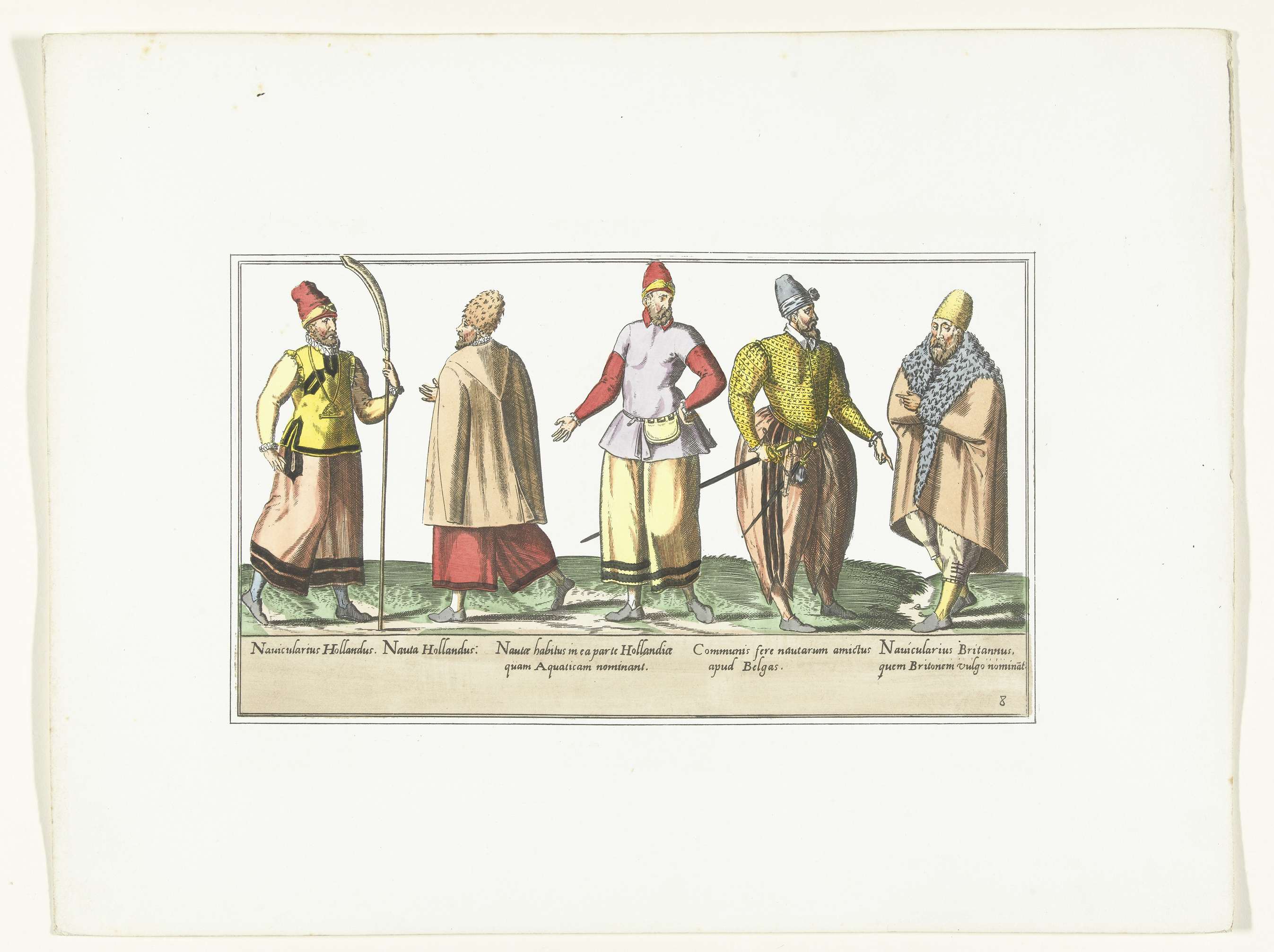 Vijf zeelieden gekleed volgens de mode in de Nederlanden en Bretagne, ca. 1580. Onderdeel van de serie Habitus Variarum Gentium, kostuumprenten in facsimile, planche 8.