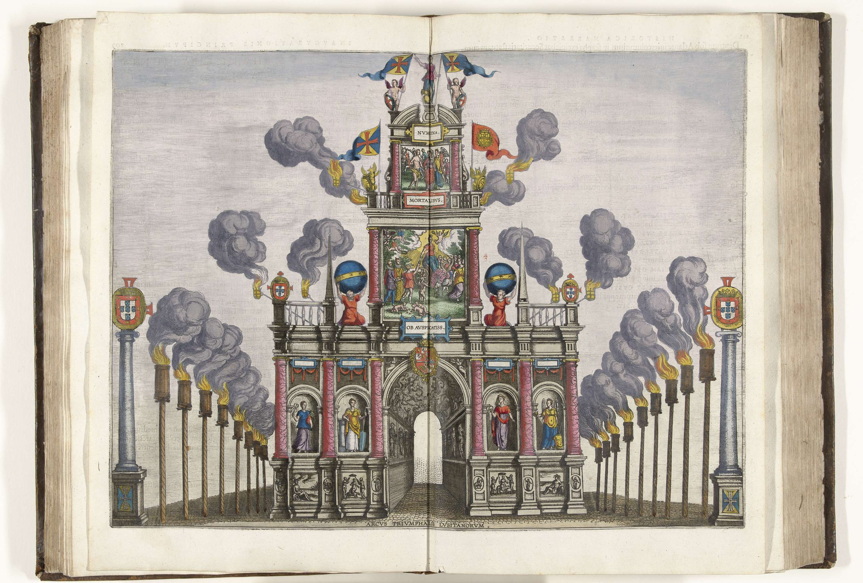 De Portugese erepoort (voorzijde), december 1599. Triomfpoort versierd met allegorische scènes en figuren. Centraal een voorstelling met de begroeting van Albrecht en Isabella door Juno. Aan weerszijden twee rijen palen met brandende pektonnen. Tijdens de intocht te Antwerpen opgesteld op de hoek van de Huidevettersstraat. Onderdeel van: Historica narratio profectionis et inaugurationis serenissimorum Belgii principum ...
