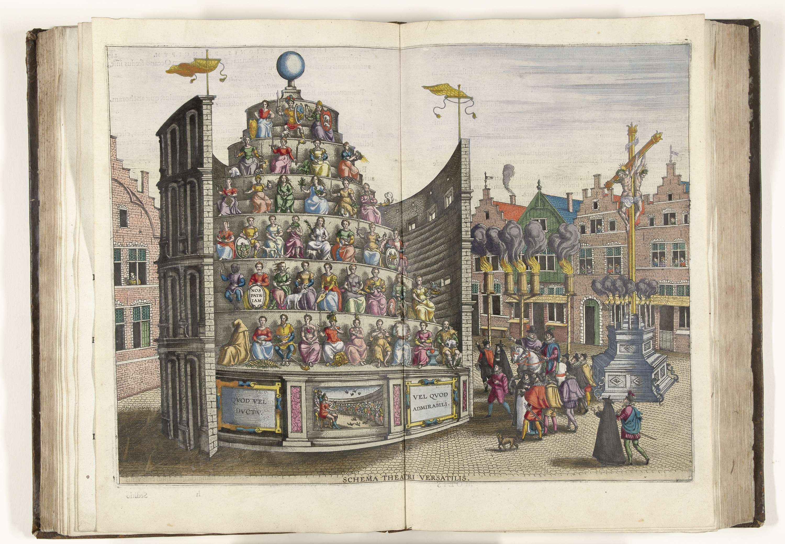 Theater van oorlog en vrede, december 1599. Trapsgewijs opgebouwde theater met personificaties van de Oorlog en allerlei hiermee verbonden begrippen. Gesitueerd aan een plein tegenover een dubbel kruisbeeld, Tijdens de intocht te Antwerpen opgesteld op de Meirbrug. Onderdeel van: Historica narratio profectionis et inaugurationis serenissimorum Belgii principum Alberti et Isabellae Austriae archiducum, de beschrijving van ...