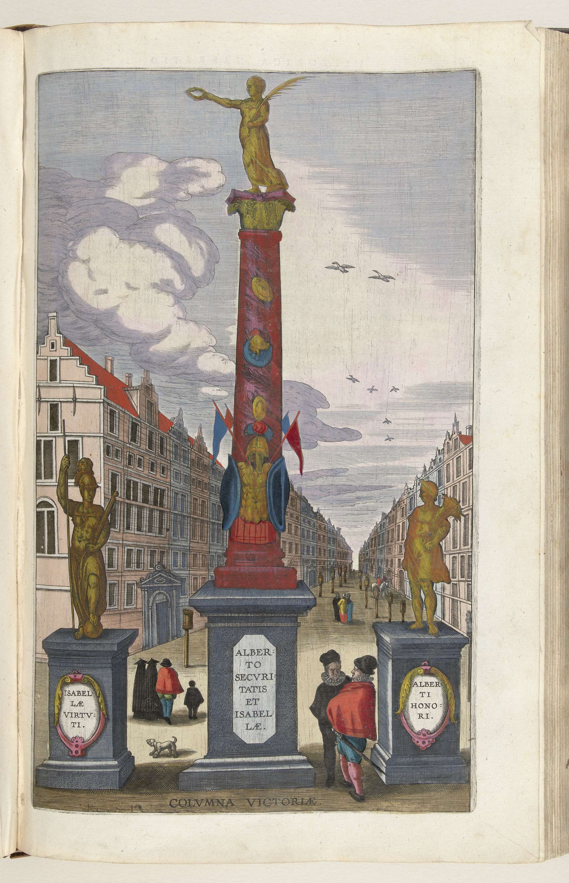 Zuil bekroond met een standbeeld van de Overwinning, december 1599. Tijdens de intocht te Antwerpen. Onderdeel van: Historica narratio profectionis et inaugurationis serenissimorum Belgii principum Alberti et Isabellae Austriae archiducum, de beschrijving van de intochten van het paar te Brussel, Antwerpen, Gent en Valenciennes, 1599.