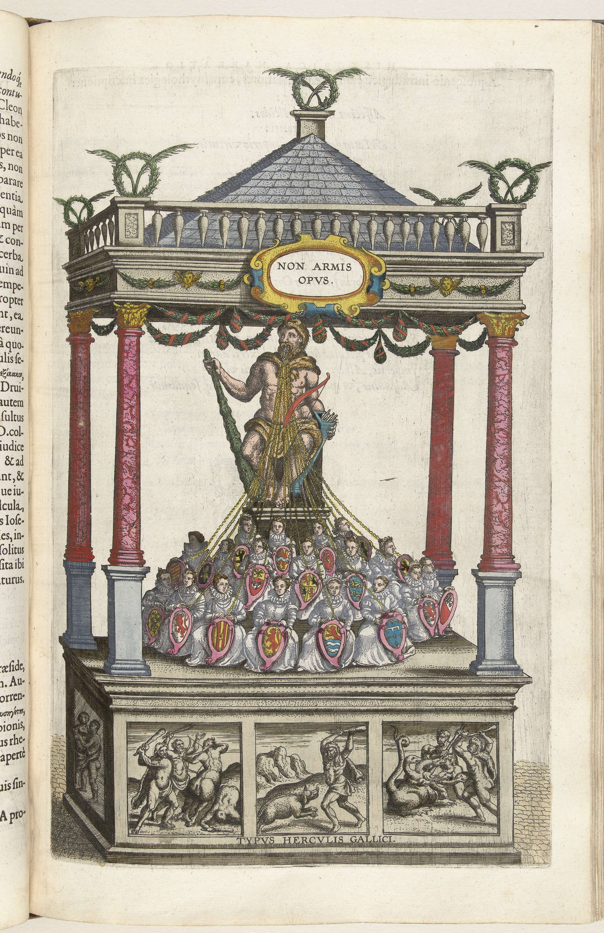 Hercules Gallicus, december 1599. Toneel met een groot beeld van Hercules met de personificaties van de 17 provincies vastgeketend met gouden kettingen aan zijn mond. Op het voetstuk de werken van Hercules. Tijdens de intocht te Antwerpen opgesteld op de Melkmarkt. Onderdeel van: Historica narratio profectionis et inaugurationis serenissimorum Belgii principum Alberti et Isabellae Austriae ...
