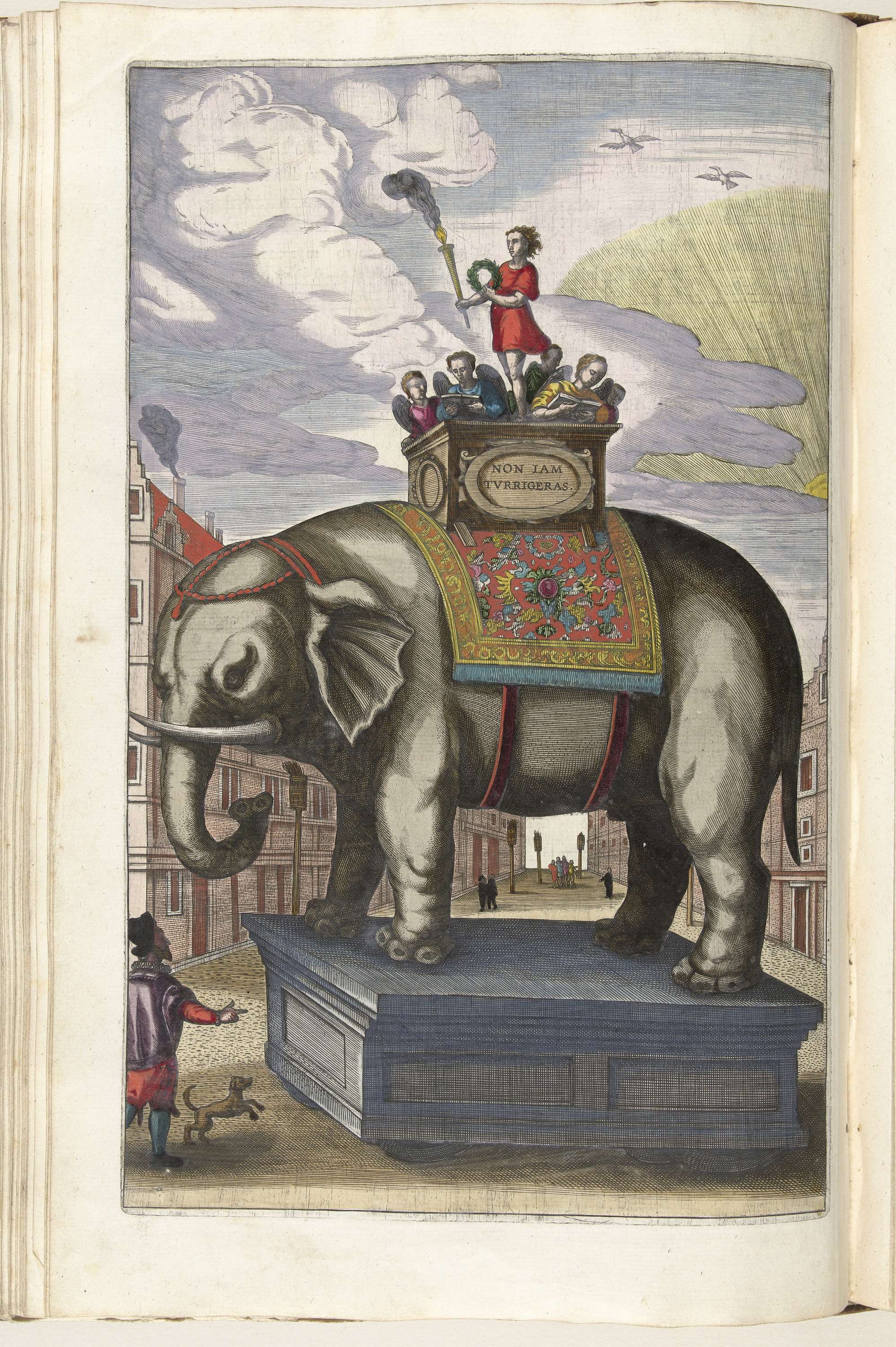 Praalwagen met een olifant, december 1599. Tijdens de intocht te Antwerpen. Onderdeel van: Historica narratio profectionis et inaugurationis serenissimorum Belgii principum Alberti et Isabellae Austriae archiducum, de beschrijving van de intochten van het paar te Brussel, Antwerpen, Gent en Valenciennes, 1599.