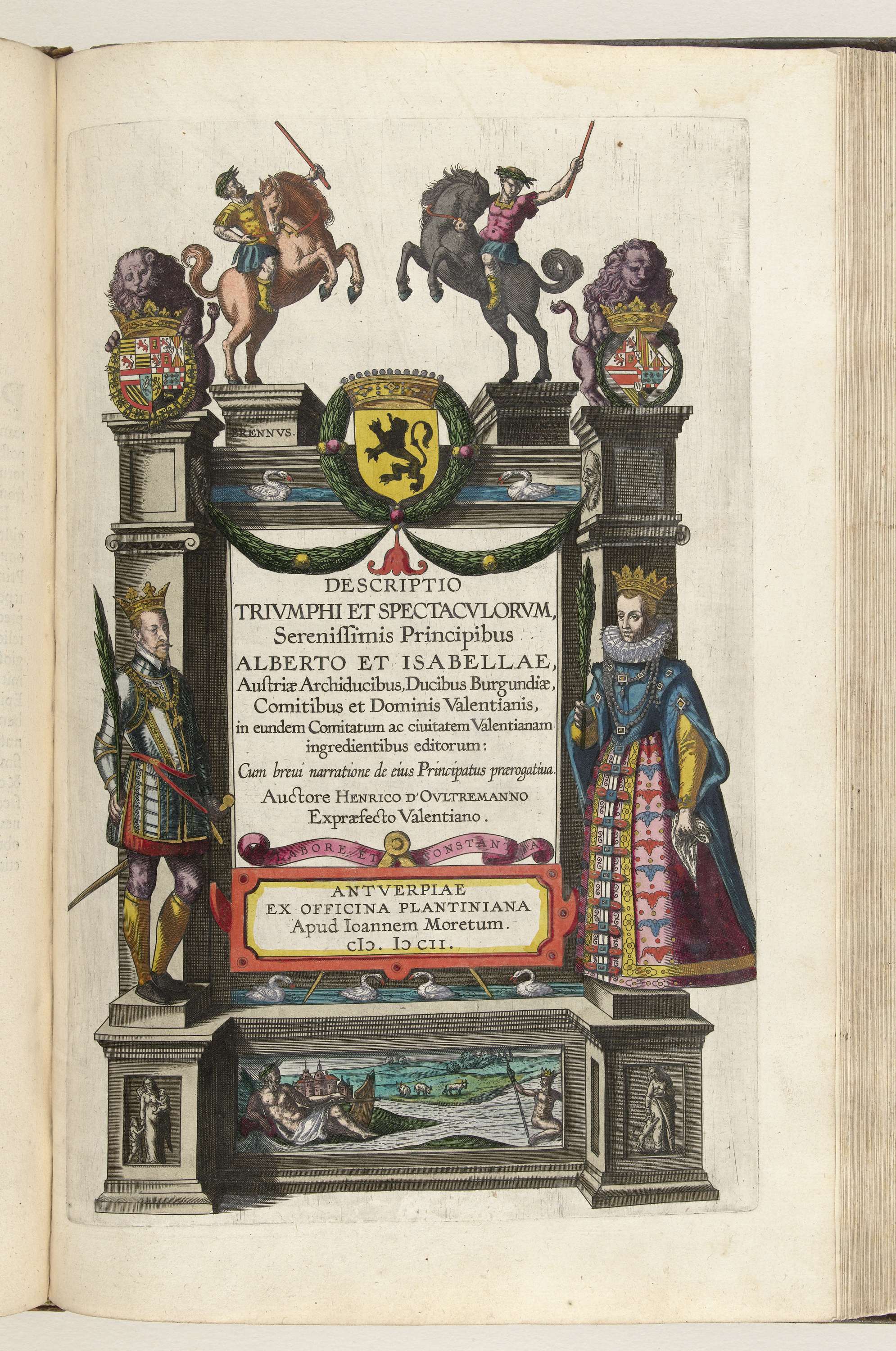 Titelprent voor Descriptio triumphi et spectaculorum van H. d'Outreman, de beschrijving van de intocht van Albrecht en Isabella te Valenciennes, december 1599. Titelprent met de Latijnse titel in een architecturale omlijsting met aan weerszijden staande de aartshertog Albrecht van Oostenrijk en Isabella Clara Eugenia, infante van Spanje. Bovenaan twee Romeinse ruiters, Brennus en Valentinianus. Onderdeel ...