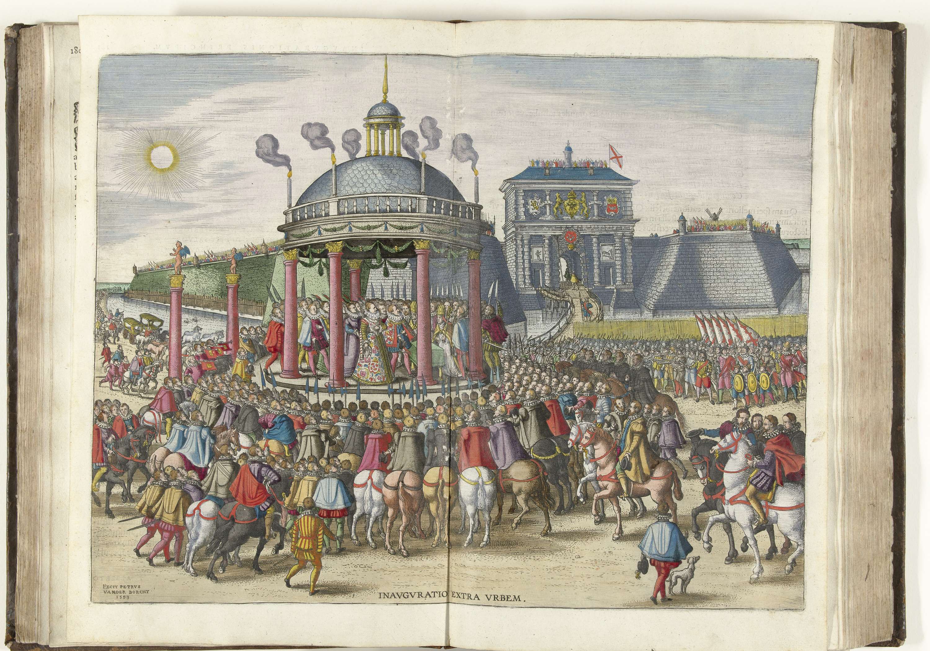 Albrecht en Isabella leggen de eed af als markgraven van Antwerpen, ceremonie onder een koepel bij de Keizerspoort buiten de stad, december 1599. Tijdens de intocht te Antwerpen. Onderdeel van: Historica narratio profectionis et inaugurationis serenissimorum Belgii principum Alberti et Isabellae Austriae archiducum, de beschrijving van de intochten van het paar te Brussel, Antwerpen, Gent ...