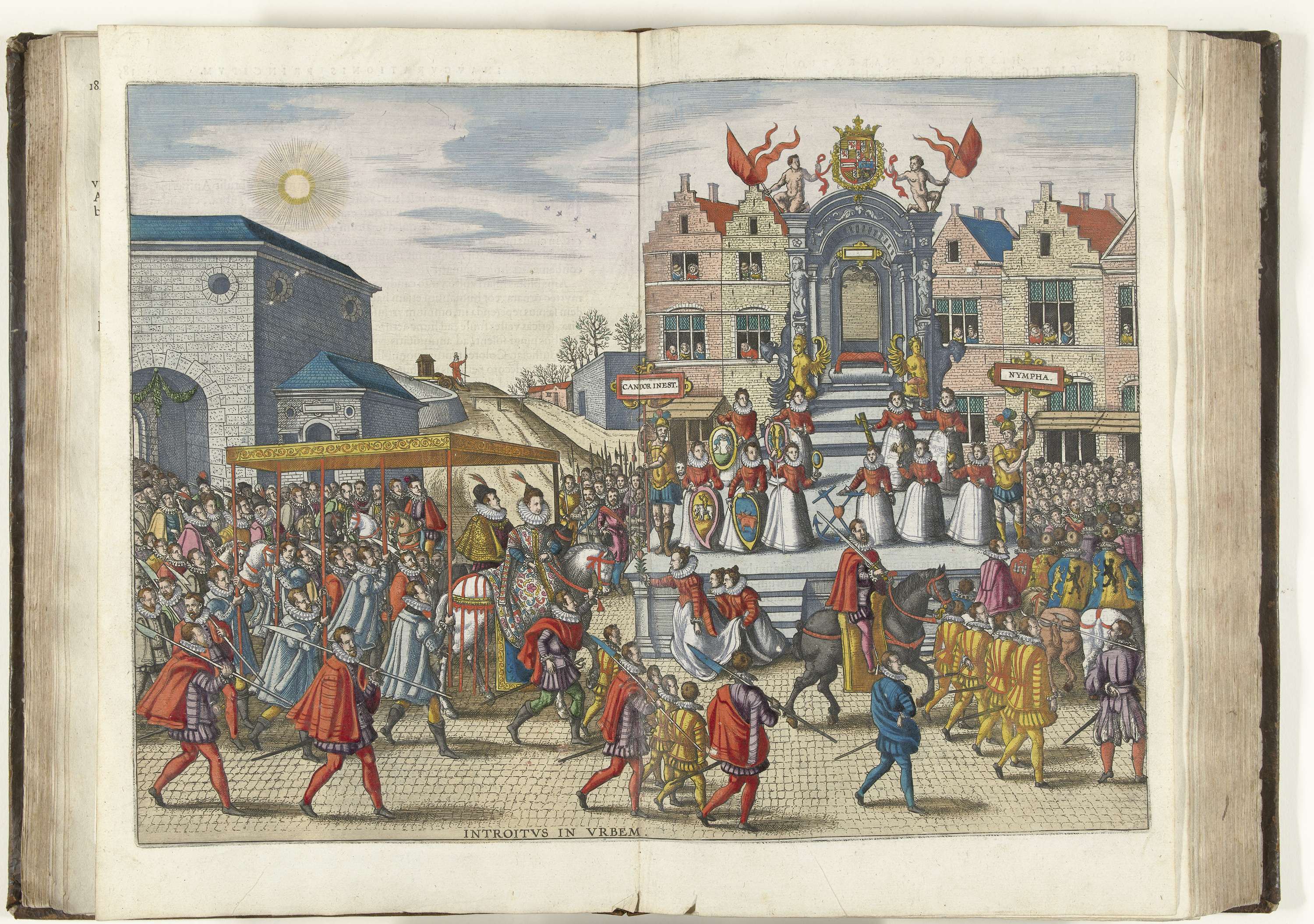Welkomst in de stad. Albrecht en Isabella te paard onder een troonhemel worden binnen de stad verwelkomd door de stadsmaagd van Antwerpen bij een toneel met allegorische figuren, december 1599. Tijdens de intocht te Antwerpen. Onderdeel van: Historica narratio profectionis et inaugurationis serenissimorum Belgii principum Alberti et Isabellae Austriae archiducum, de beschrijving van de intochten ...
