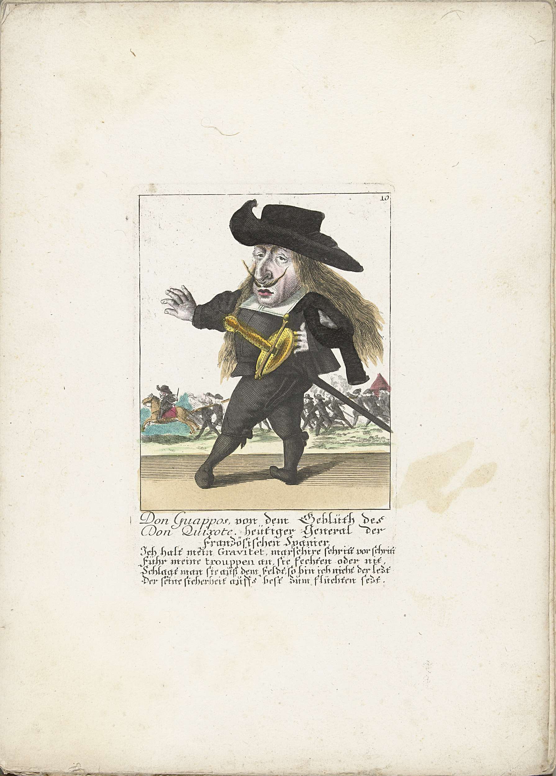 De Spaanse kleine mens Don Guappos. In het onderschrift onder de titel een vierregelig vers in het Duits. Genummerd rechtsboven: 10. Onderdeel van een losbladige uitgave uit ca. 1710 van een serie karikaturen van kleine mensen, bekend als Het Dwergentooneel.