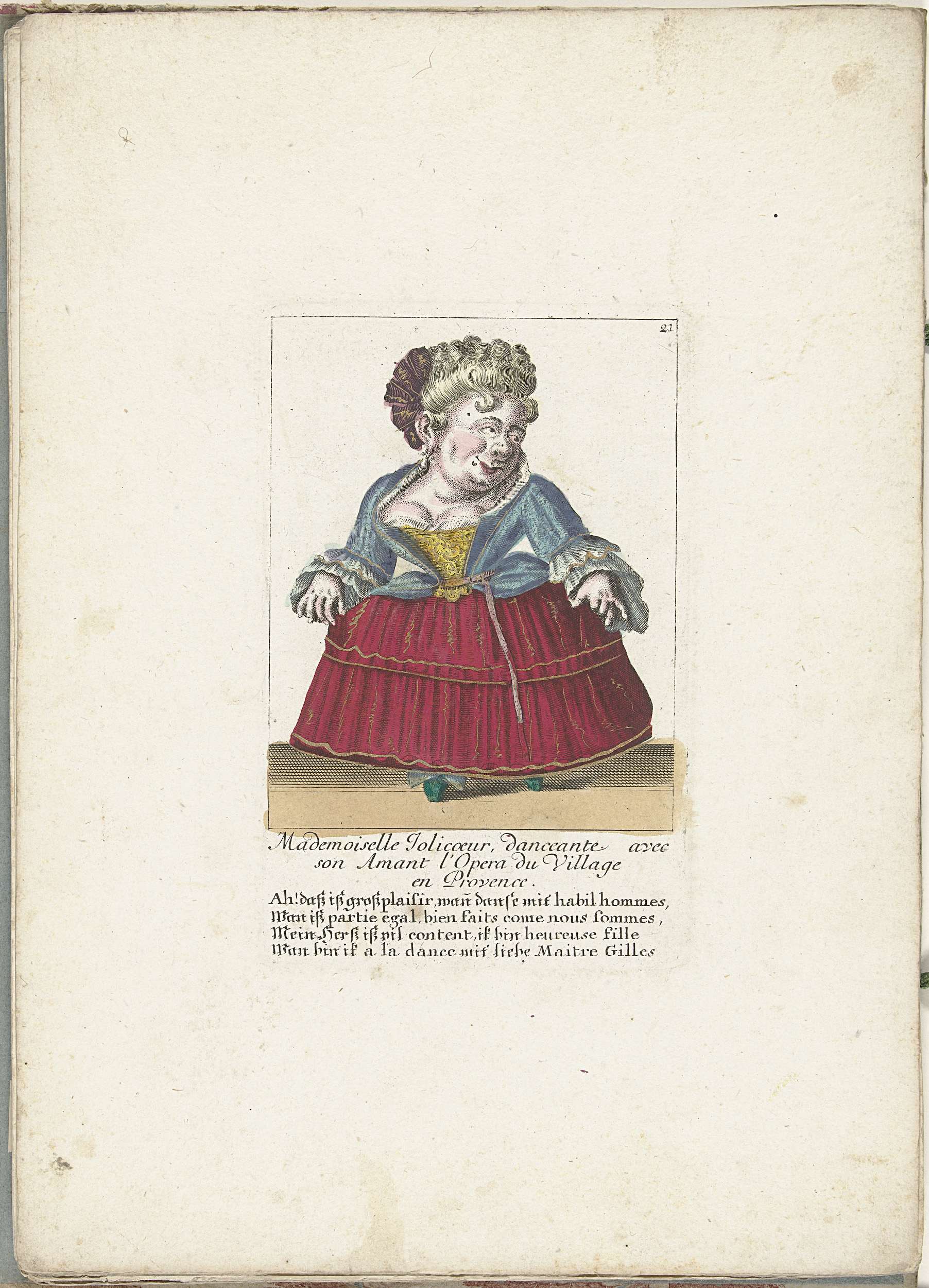 Een kleine mens als de Franse Mademoiselle Jolicoeur. In het onderschrift onder de titel een vierregelig vers in het Duits. Genummerd rechtsboven: 21. Onderdeel van een losbladige uitgave uit ca. 1710 van een serie karikaturen van kleine mensen, bekend als Het Dwergentooneel.