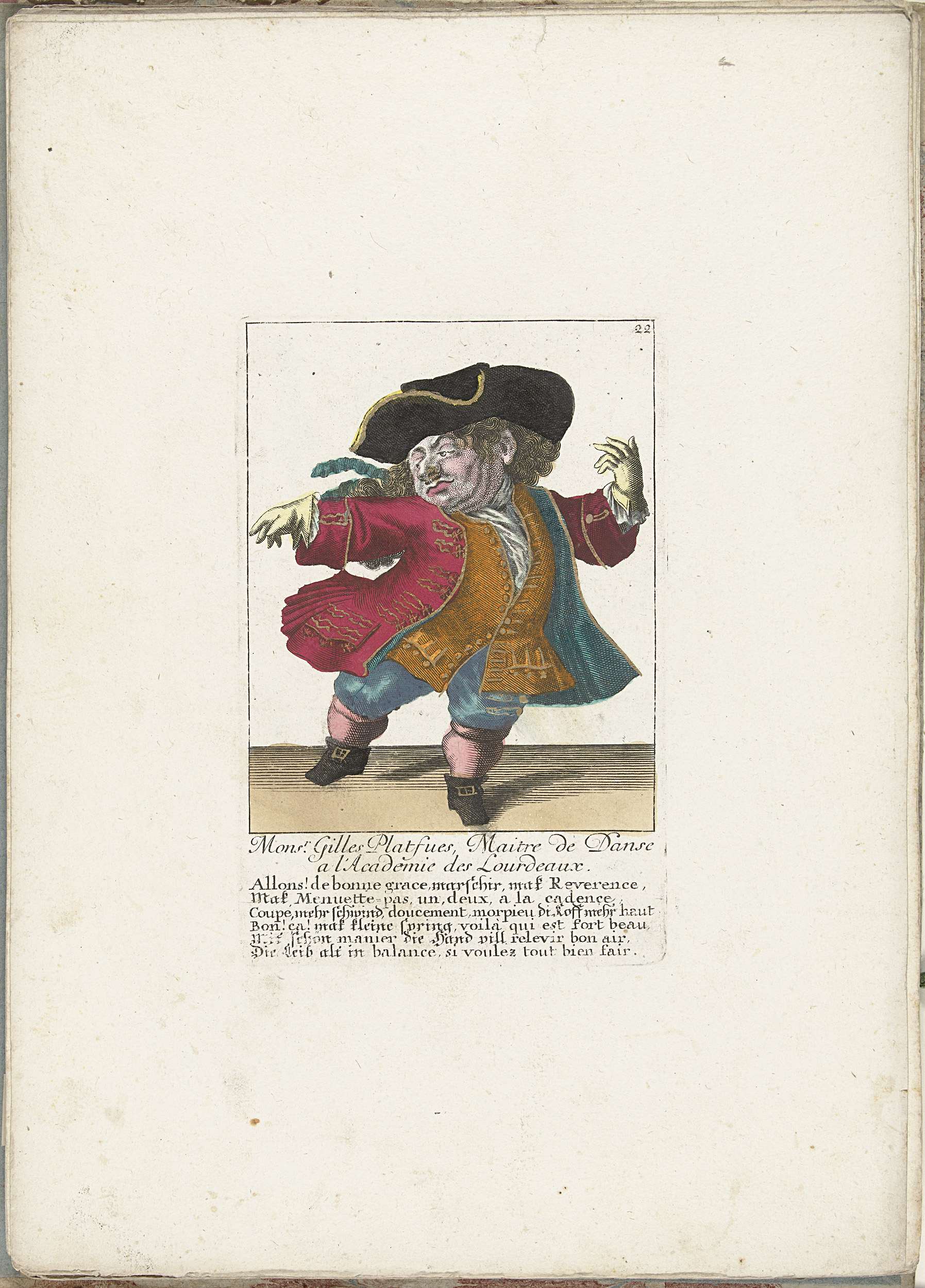 De kleine mens Gilles Platfues als Franse dansmeester. In het onderschrift onder de titel een zesregelig vers in het Frans en Duits. Genummerd rechtsboven: 22. Onderdeel van een losbladige uitgave uit ca. 1710 van een serie karikaturen van kleine mensen, bekend als Het Dwergentooneel.