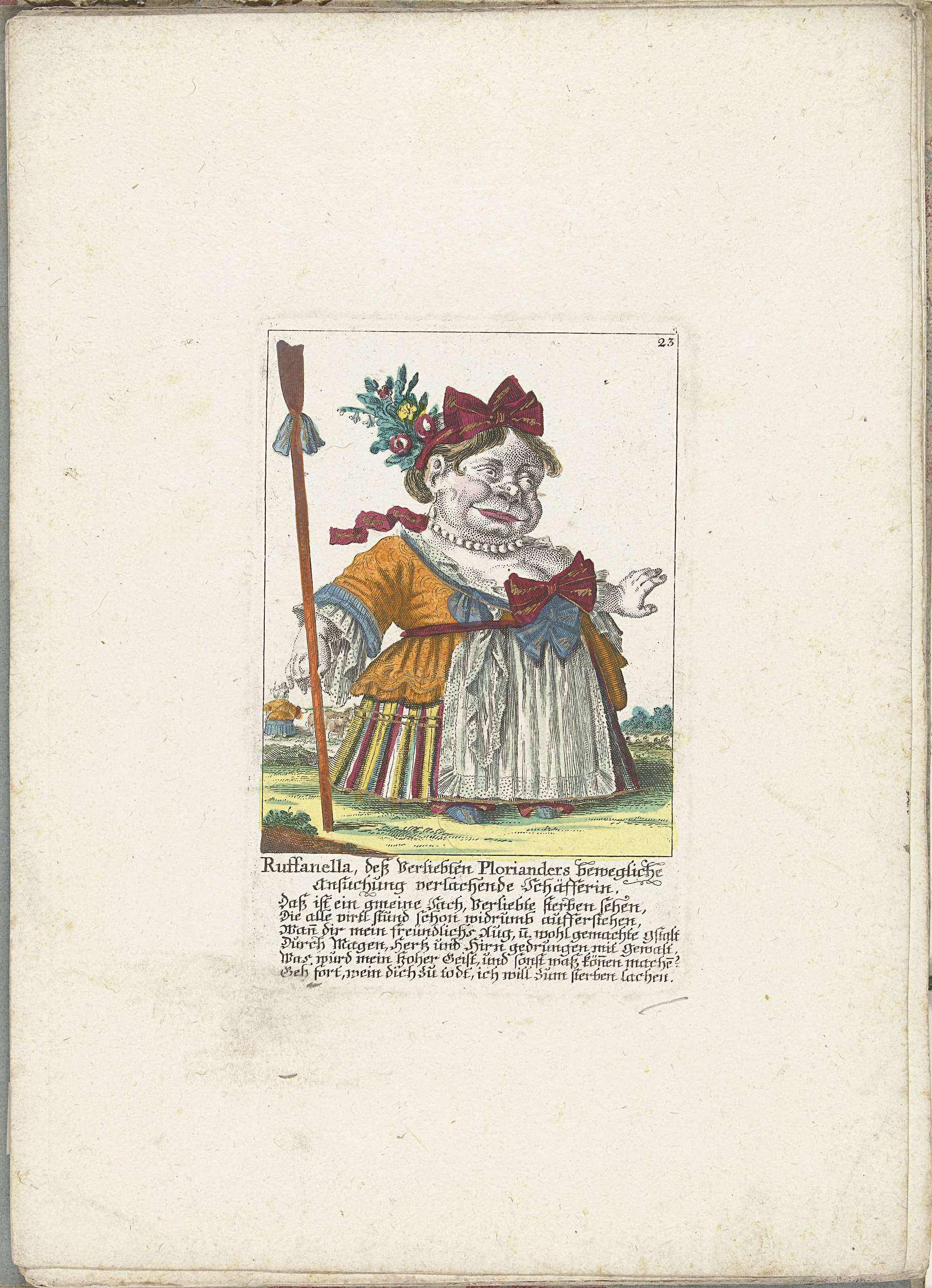 De kleine mens Ruffanella als herderin op wie Ploriander verliefd is. In het onderschrift onder de titel een zesregelig vers in het Duits. Genummerd rechtsboven: 23. Onderdeel van een losbladige uitgave uit ca. 1710 van een serie karikaturen van kleine mensen, bekend als Het Dwergentooneel.
