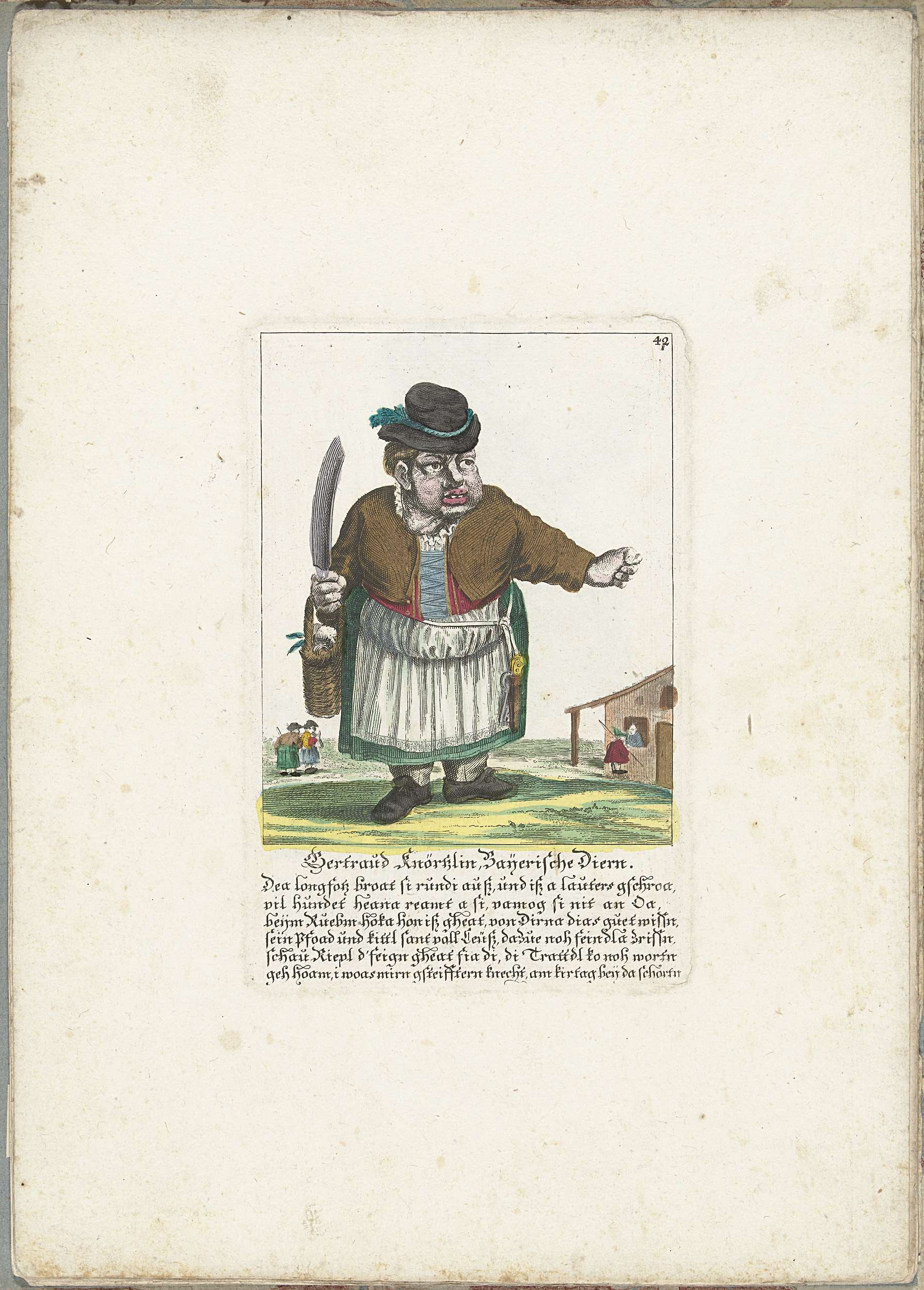 De Beierse kleine mens Gertraud Knörtzlin, in de ene hand een hakmes en een mand met eieren, met de andere hand maakt zij een obsceen gebaar. In het onderschrift onder de titel een zesregelig vers in het Duits. Genummerd rechtsboven: 42. Onderdeel van een losbladige uitgave uit ca. 1710 van een serie karikaturen van kleine ...