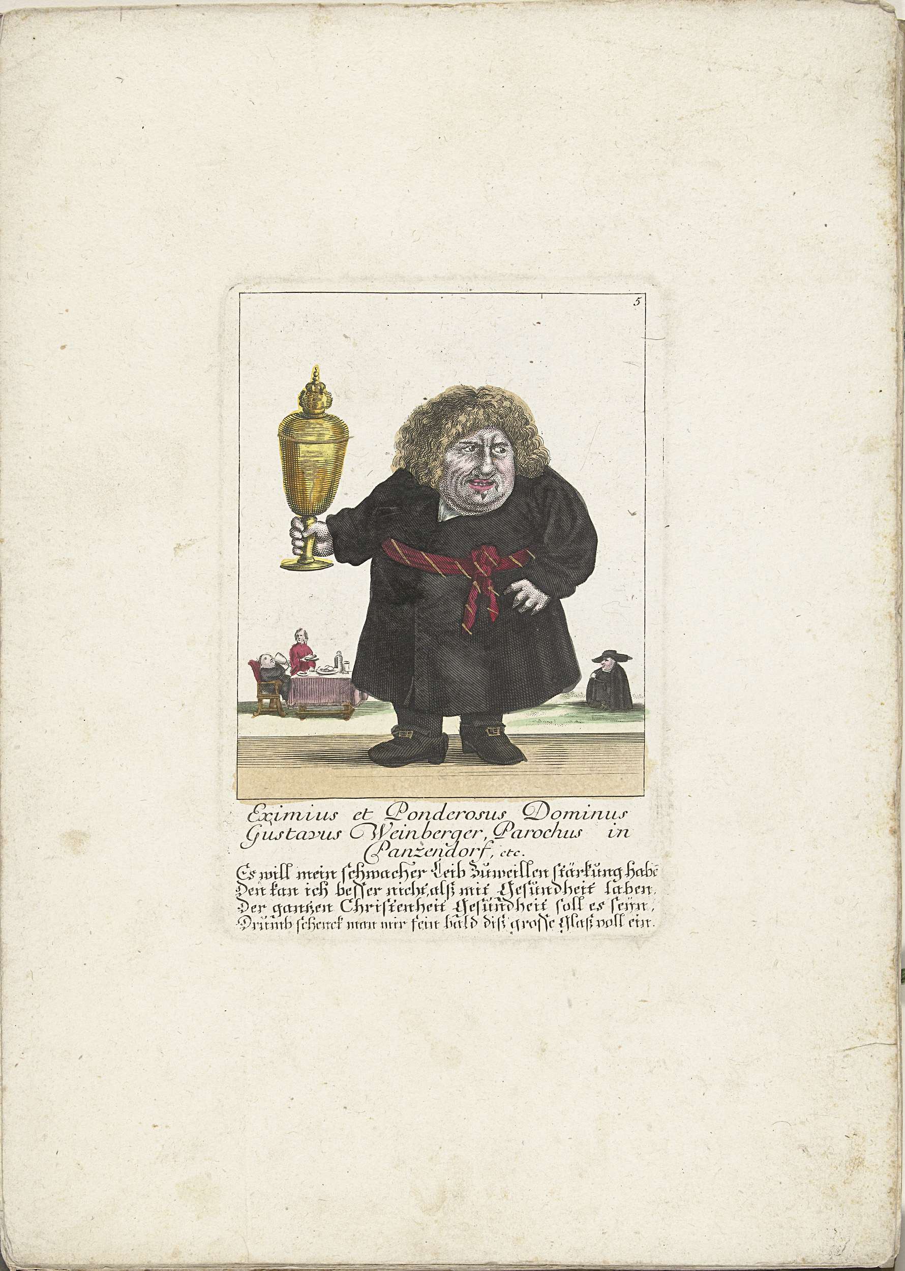 De kleine mens Gustavus Weinberger als een geestelijke met een gouden beker. In het onderschrift onder de titel een vierregelig vers in het Duits. Genummerd rechtsboven: 5. Onderdeel van een losbladige uitgave uit ca. 1710 van een serie karikaturen van kleine mensen, bekend als Het Dwergentooneel.